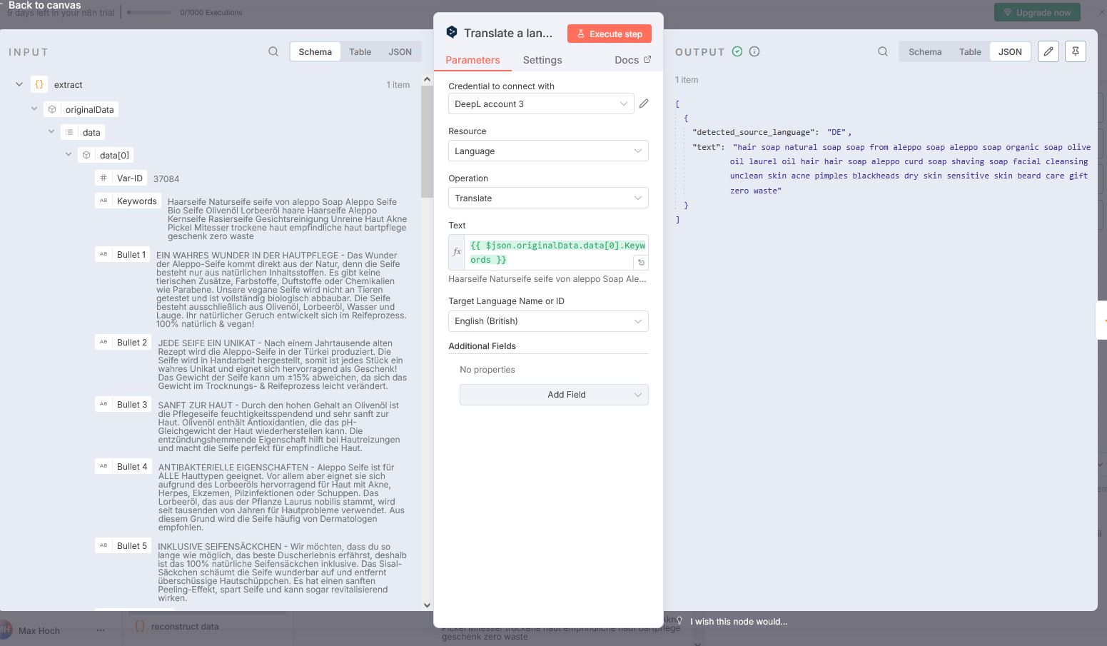 Next configure your DeepL node to translate the extracted text
