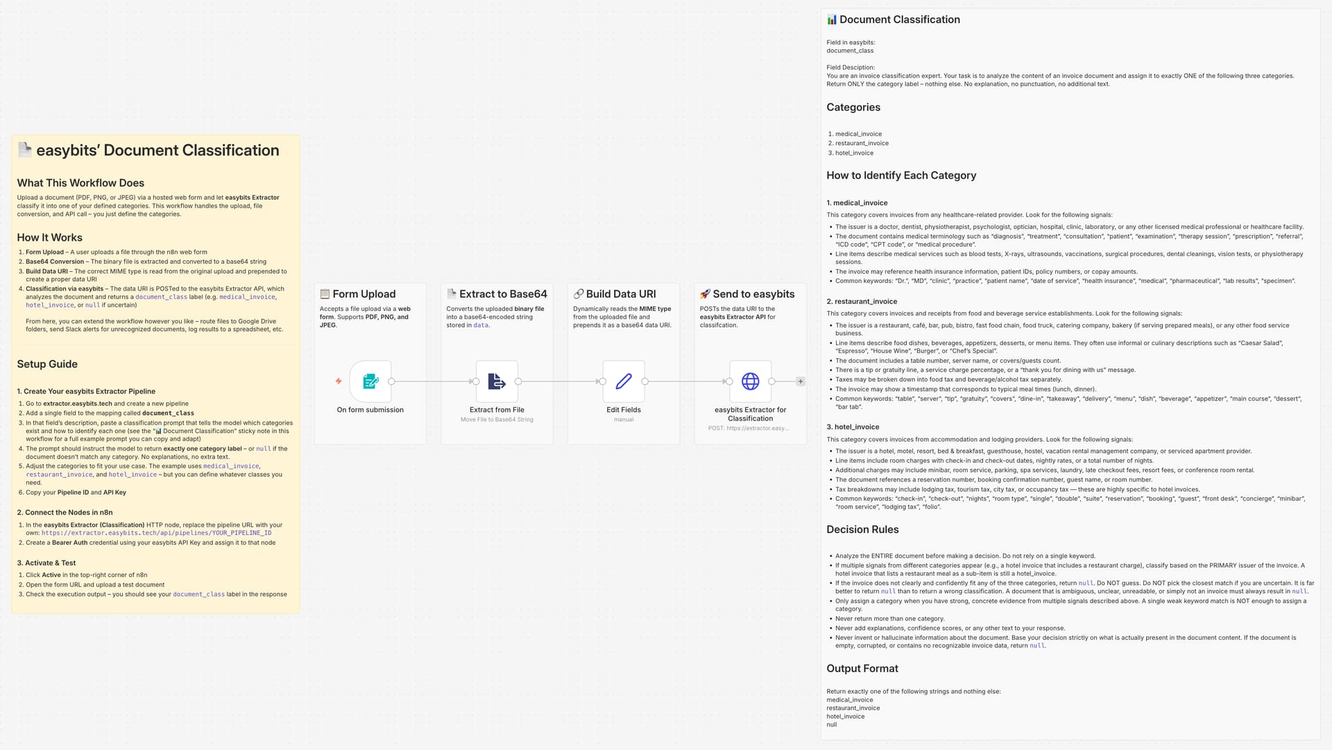 I’ve included a full example prompt as a sticky note inside the workflow so you can just copy it and adjust the categories to your own use case. The example covers three invoice types, but you can add or remove categories as needed.