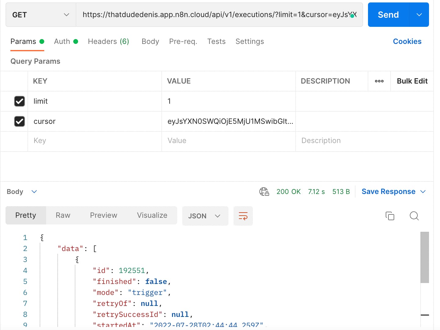 For some reason, the cursor query parameter doesn’t seem to be doing anything. I’m testing with limit=1, and when I put the initial response’s nextCursor back into the cursor query parameter, it doesn’t paginate and spits out the exact same result. The response is the exact same execution AND the exact same nextCursor.