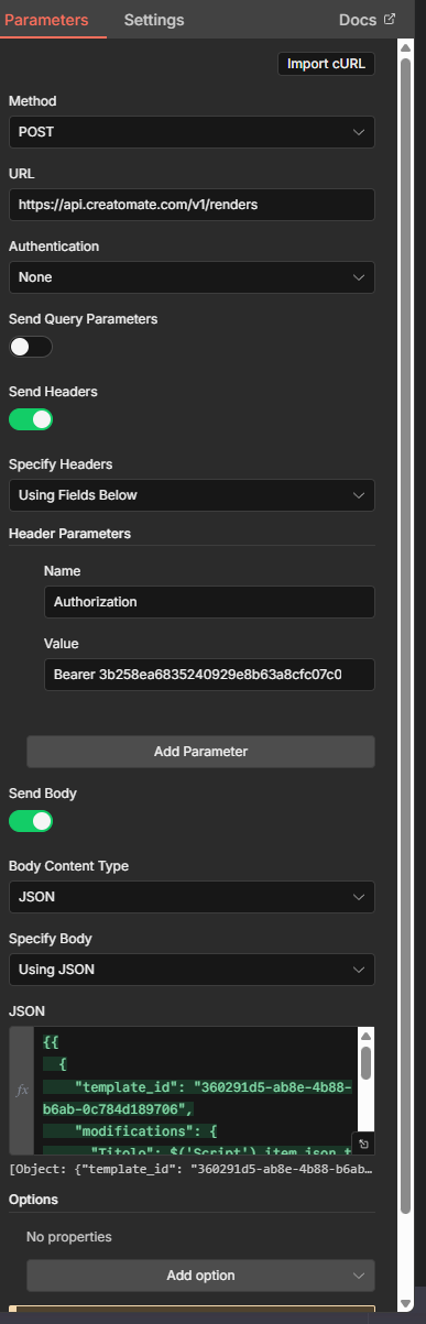 “cause”: “=https://api.creatomate.com/v1/renders/{{ $(‘Creatomate Init’).item.json.id}}”,