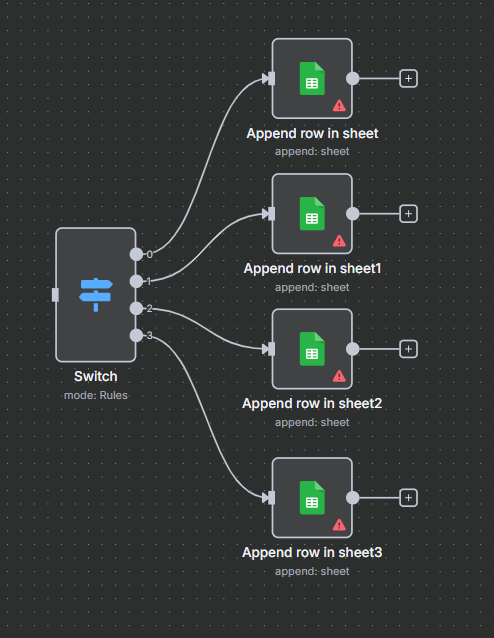 and it just dumps all the data in the first sheet it matches eventhough the output $json.type is dynamic as seen in the dump text in the sheet. The other sheets are empty.