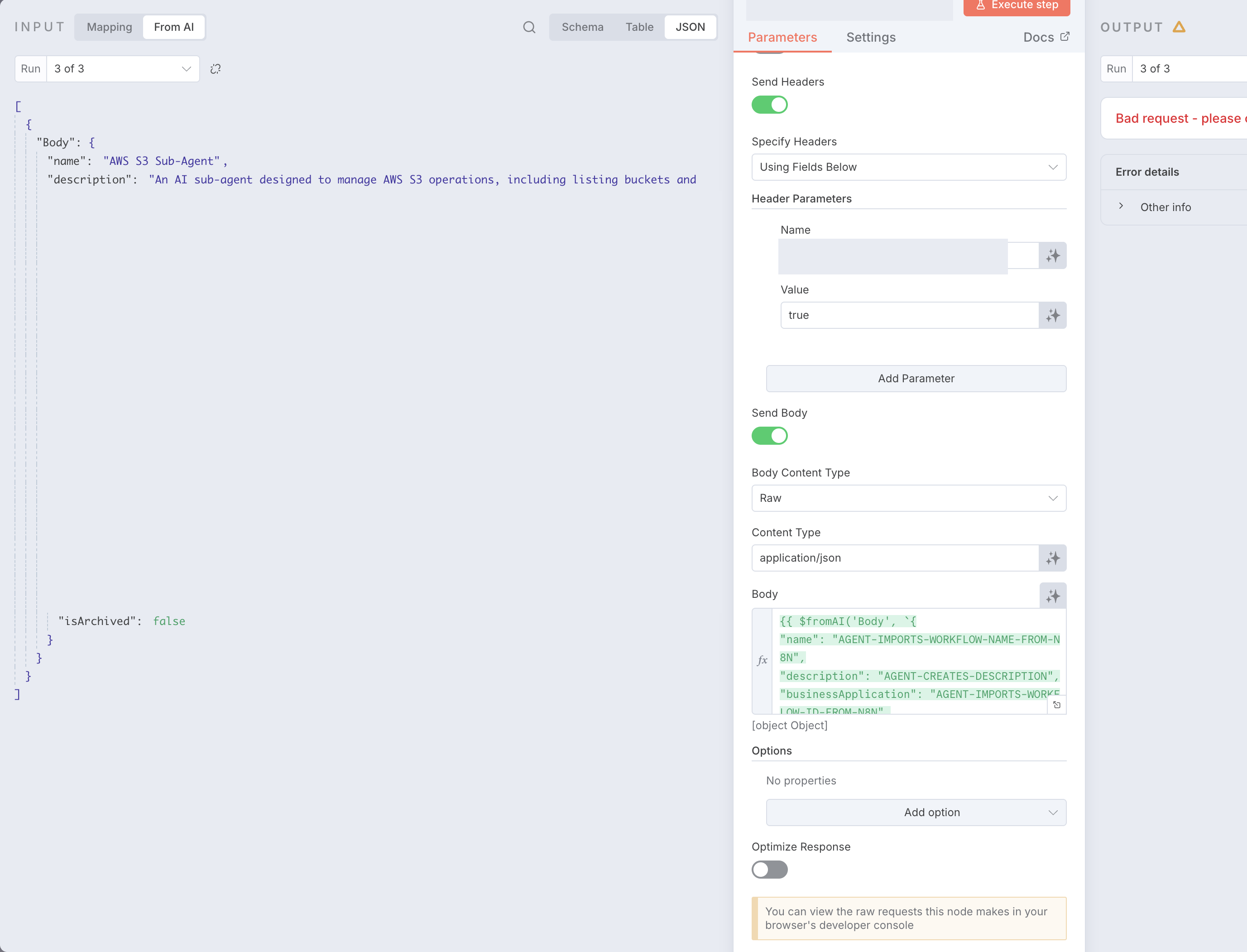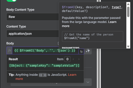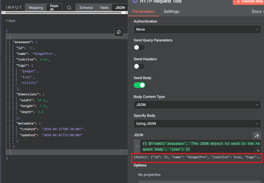 With that metadata, the agent calls a new HTTP POST call to our server, in which the body of the POST call is filled in by the model. In the description I have provided the model with the schema it should follow. Our server requires the body to be application/json for an HTTP request. The model is able to successfully follow the schema, however, it always creates a Array when it should be creating a Object.