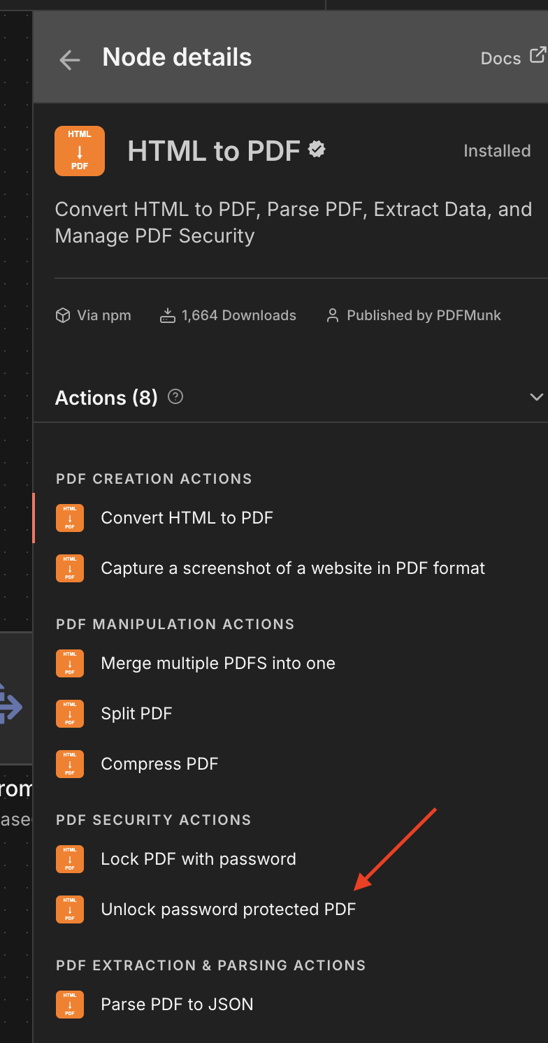 There’s a native node on n8n called ‘HTML to PDF’by PDFMunk that also supports ‘Unlock PDF’ as an action.