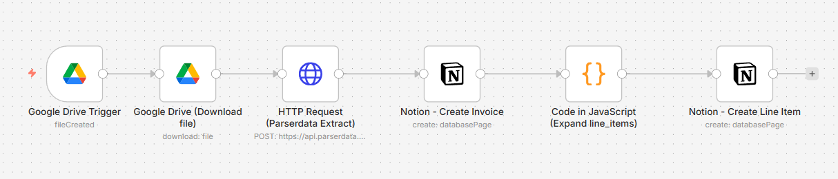 This workflow automatically watches a Google Drive folder for new documents (PDF/Image invoices), processes them through the ParserData enterprise AI engine, and saves structured data (Date, Vendor, Total, plus full Line Items) directly into structured Notion Databases.