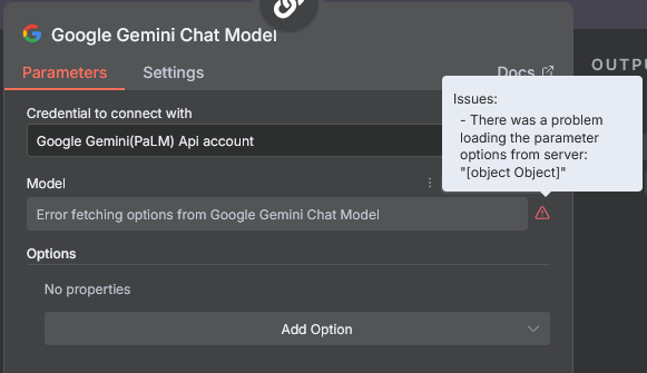 n8n-8fd5b7c69-f4wnk 2025-09-26T15:05:06.700Z | debug | Credential test failed {"tags":{},"timestamp":1758899106699,"context":{"itemIndex":0,"runIndex":0},"functionality":"regular","name":"NodeApiError","node":{"id":"temp","parameters":{"temp":""},"name":"Temp-Node","type":"noOp","typeVersion":1,"position":[0,0],"credentials":{"googlePalmApi":{"id":"cJ...","name":"Google Gemini(PaLM) Api account