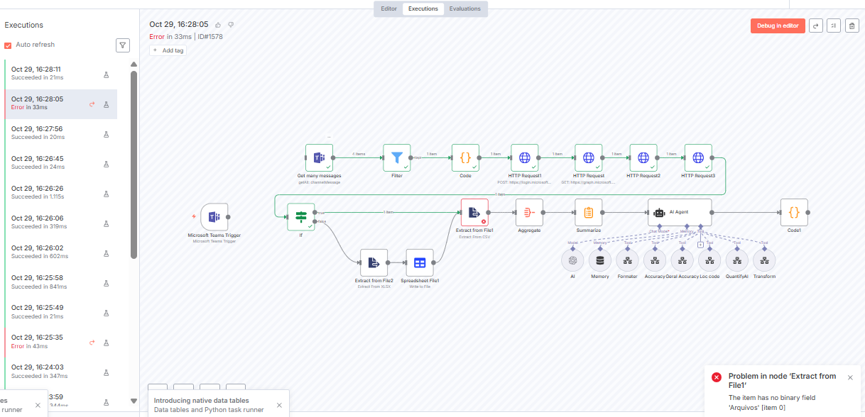 The Extract from File node is failing because the data from your previous node isn’t passing the uploaded file as binary data. To fix it, it’s important to receive the data as a binary file. I see that you are using HTTP Request nodes. The error on your end means that the node couldn’t find the binary file field named “Arquivos”. You need to select the Response Format as “File” and then the exact same name for “Put Output in Field” will go as “Input Binary Field” for the Extract from file node. In my case it is “data”: