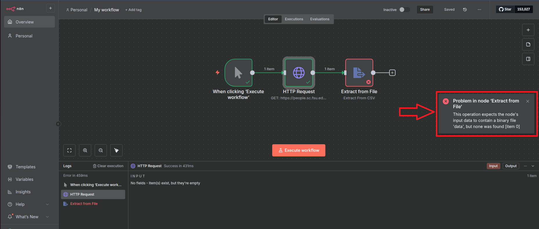 After that, the HTTP request sent the file as binary input (under the data field), and the Extract from File node is able to process the file details: