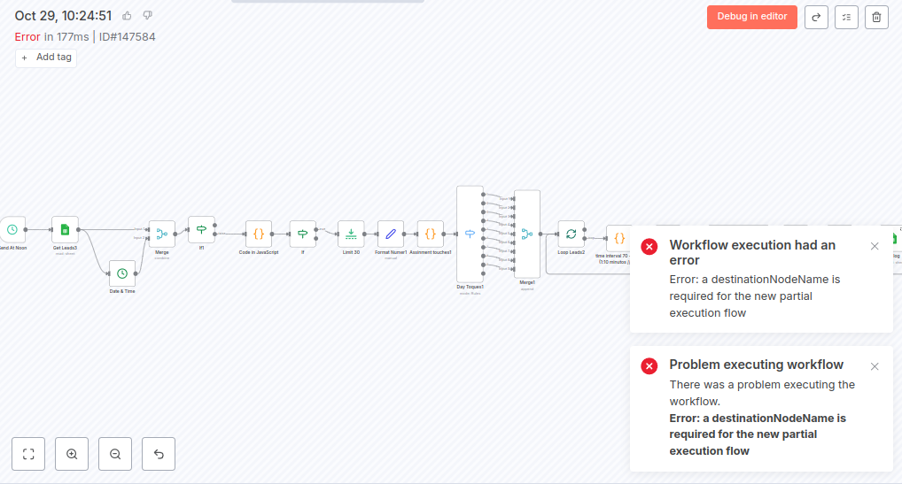 After that, the message goes to an HTTP Request node connected to WhatsApp.The loop works correctly for the first few runs, but sometimes I get this error: