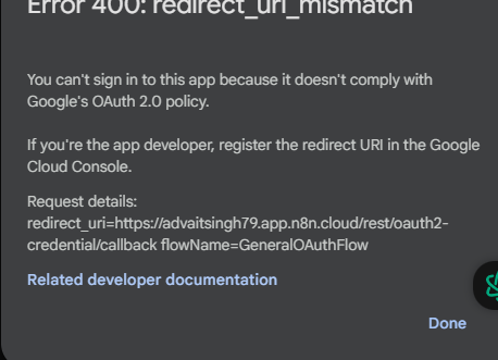 n8n Cloud is already registered and compliant with Google’s OAuth policy. This avoids redirect mismatches entirely.