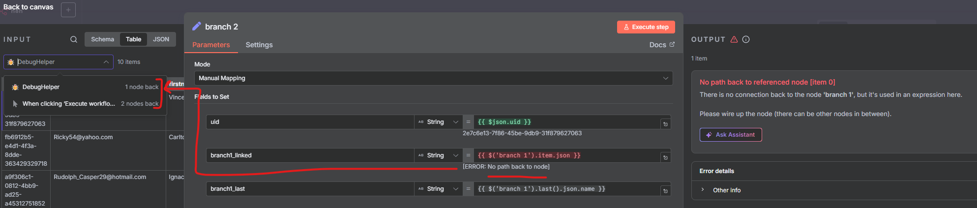 Nodes should be chained together. You can’t split them to different paths and refer each other between paths. Consider each path as a separate execution.