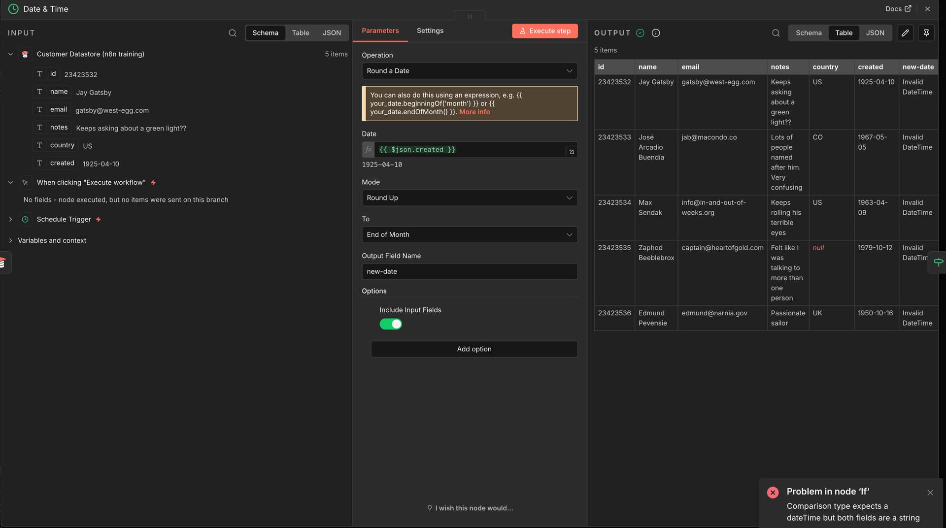 I am currently doing the Level 2 course and am on the Data Exercise example on the Processing different data types | n8n Docs website. I copied the JSON and wanted to try out the code, but the IF statement is not working. Every time I get an error saying that it is a string and does not match the date-time. I haven’t changed anything in the code and would like to understand how to solve this. In addition, the code offered as a solution in the course itself should work. Please be patient with me, I am completely new to this whole Space.