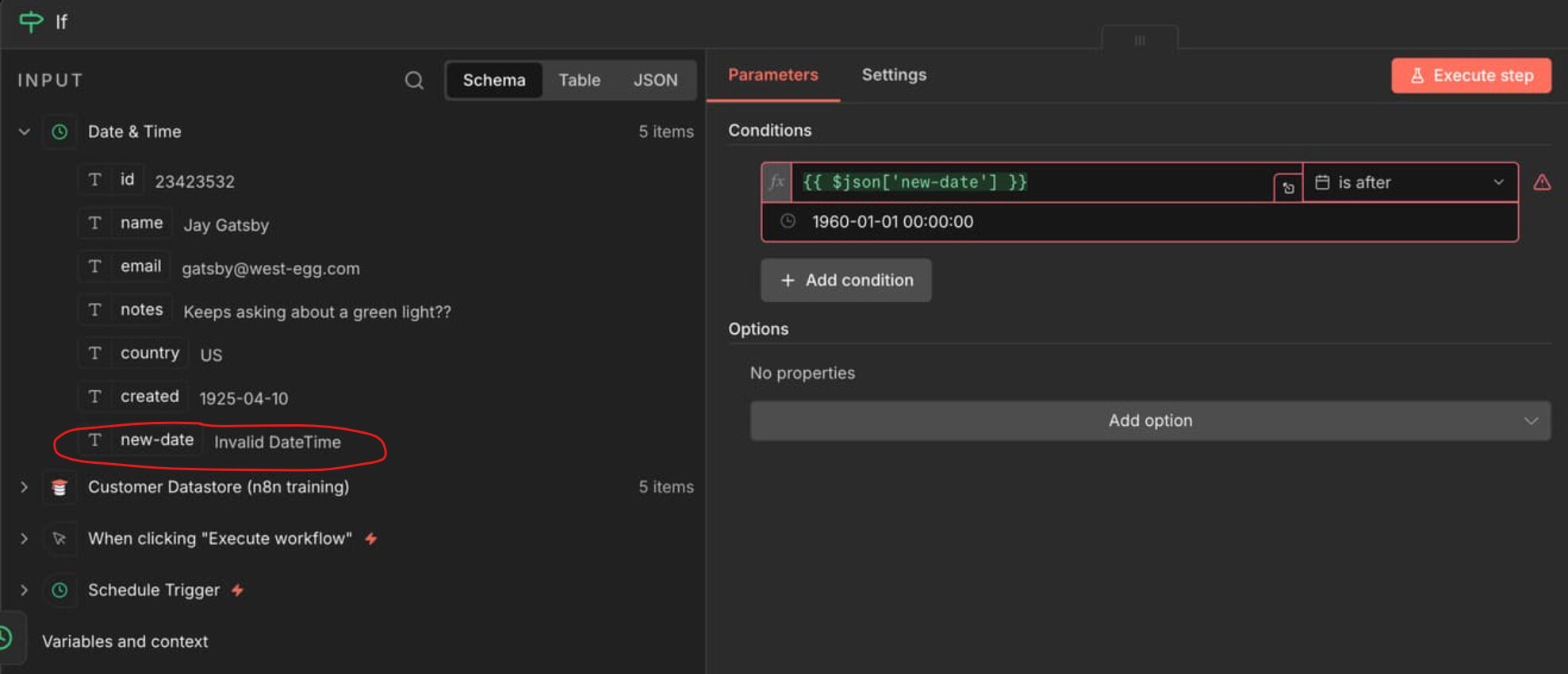 hey @Gregor welcome to the forum! So barn4k spotted it right, the issue is actually happening in the Date & Time node before the IF, not in the IF itself. When you see “Invalid Date” showing up in that preview that means the conversion already failed upstream and then the IF node is just complaining because it’s getting garbage instead of an actual datetime object.