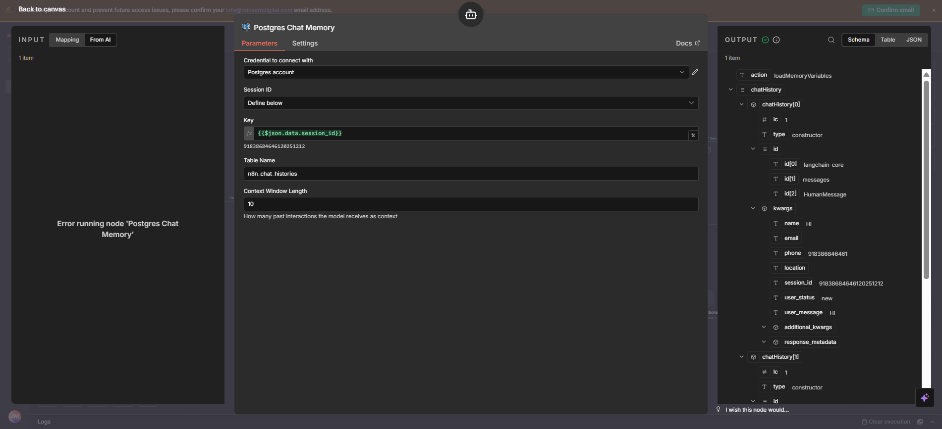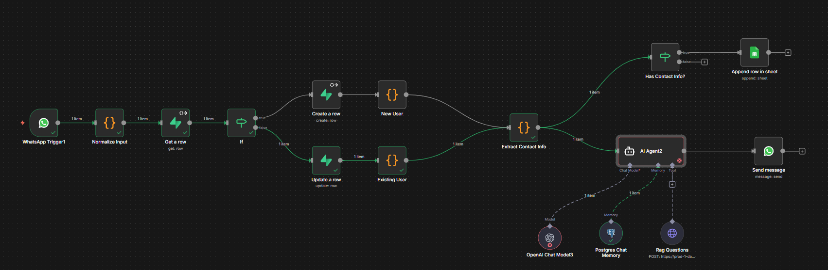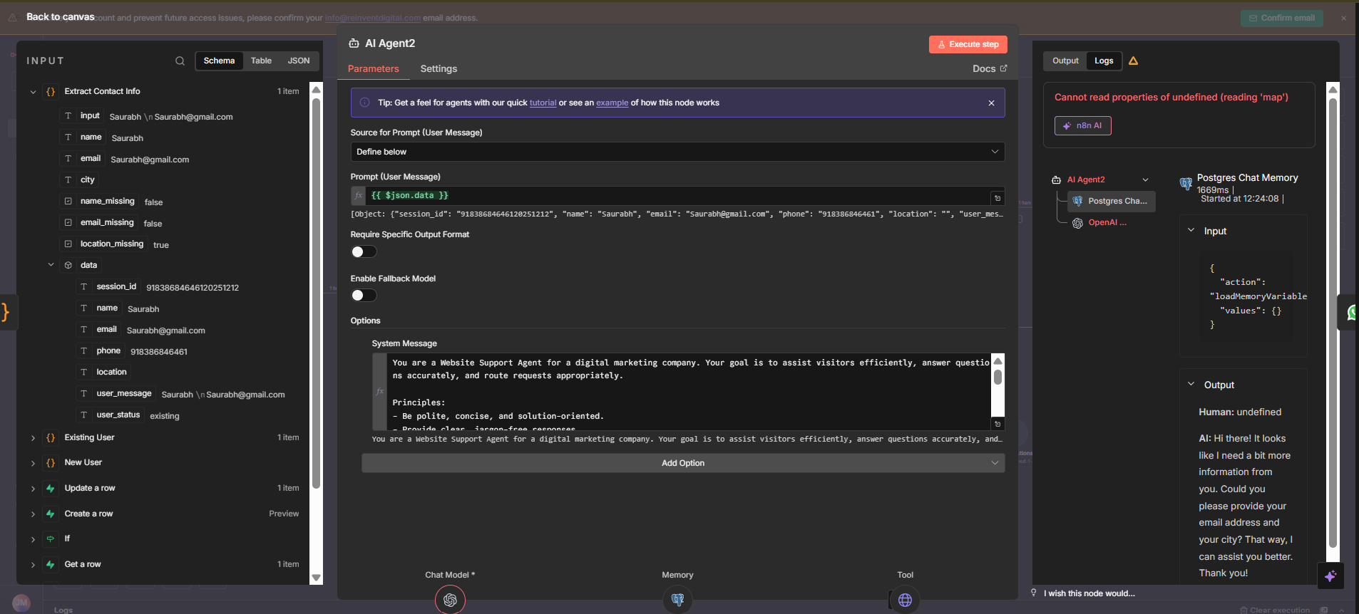 My major logic that i am building is that its a whatsapp chatbot for a website. whenever a certain user chats with it the phone number is stored in the supabase table using the create row in supabase direction and the ai agent generates the first response like provide your details (name, email, location). it is obtained on the whatsapp as a message response easily. now when the user sends the second message which is obviously (name, email, location) then it is taken in the same way but it got error at the postgres node attached to agent showing the error canβt map as the existing user node is providing object instead of a clear string to the agent.