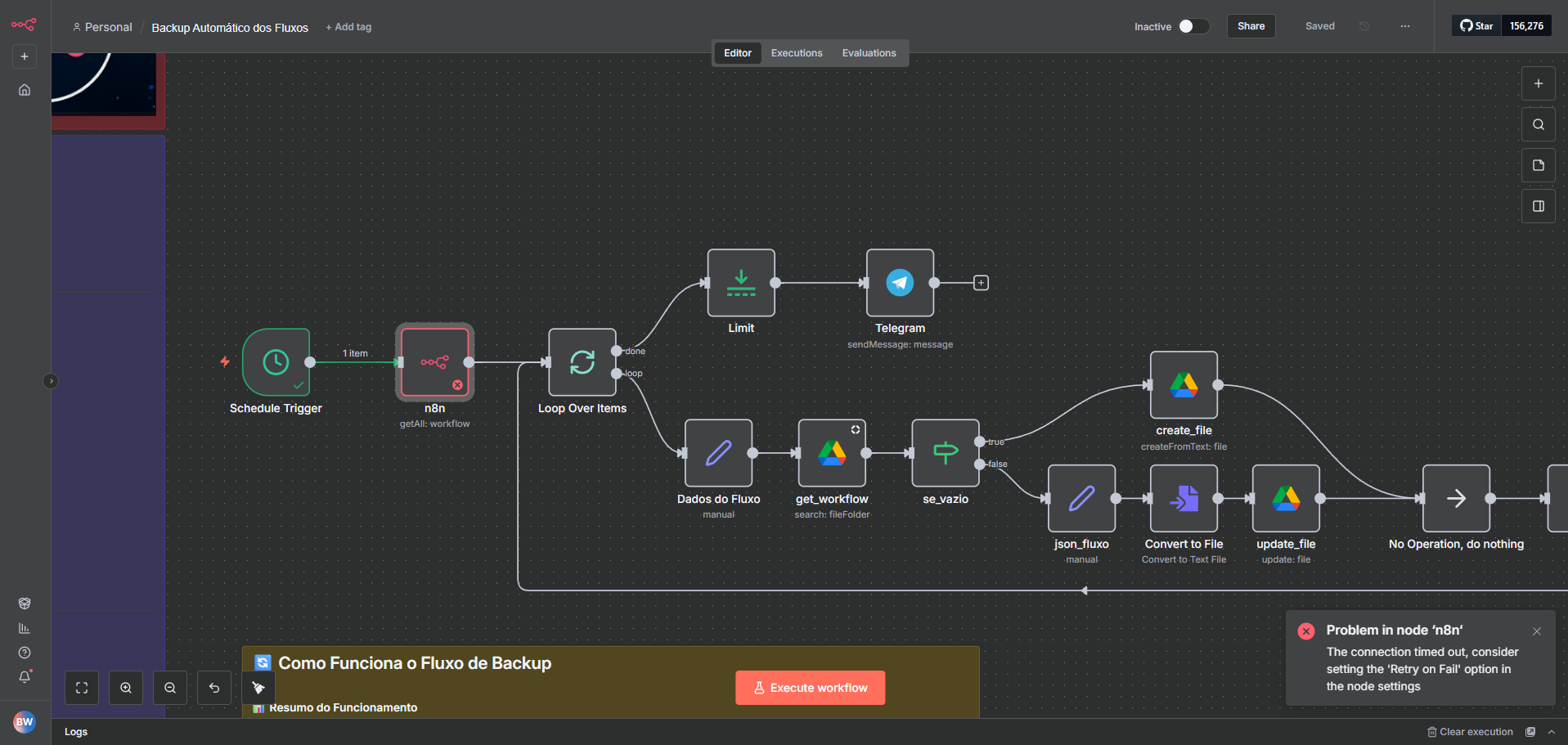 The connection timed out, consider setting the ‘Retry on Fail’ option in the node settings