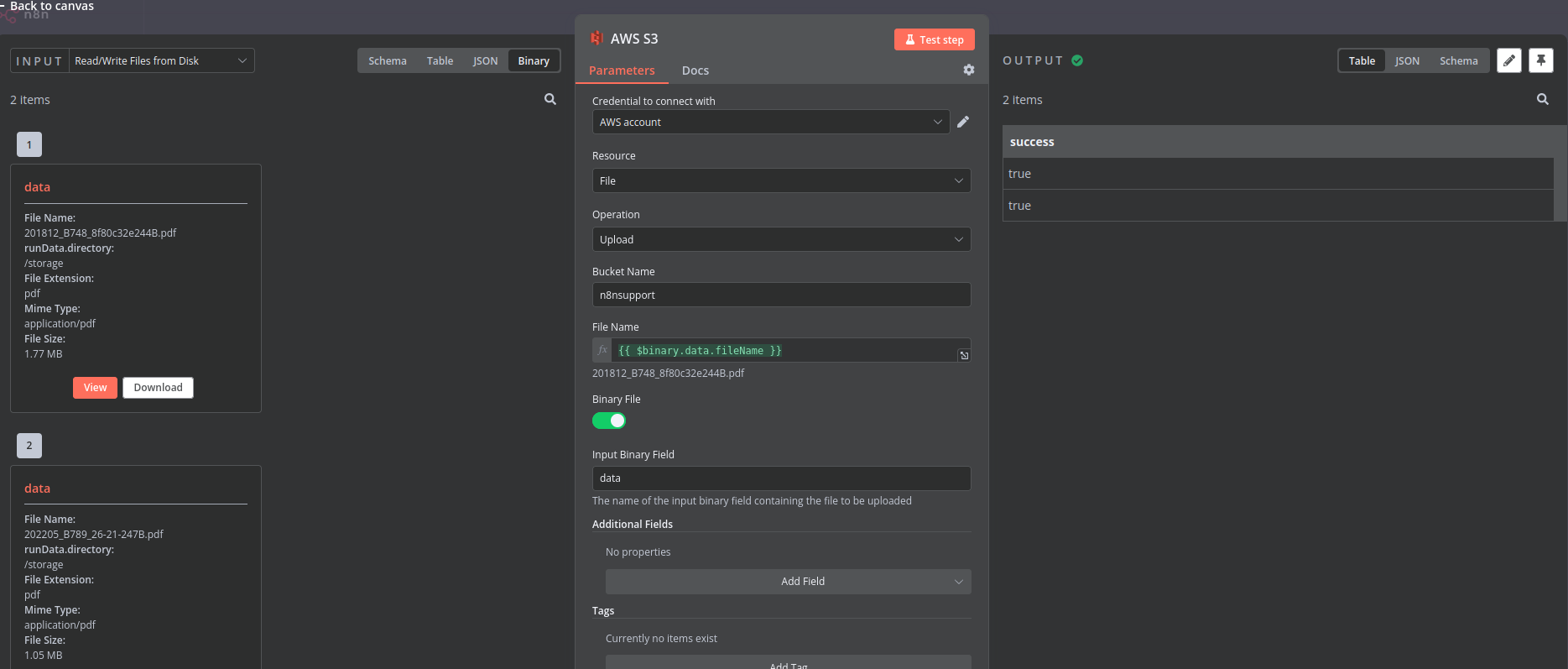 That said, I believe you don’t need the “Read PDF” node (superseded by the Extract From File node in recent n8n versions) based on the use case you have described. This node would extract the file content from a binary file, but this step isn’t required if you’re just looking to upload the file itself to S3 (or any other location really).