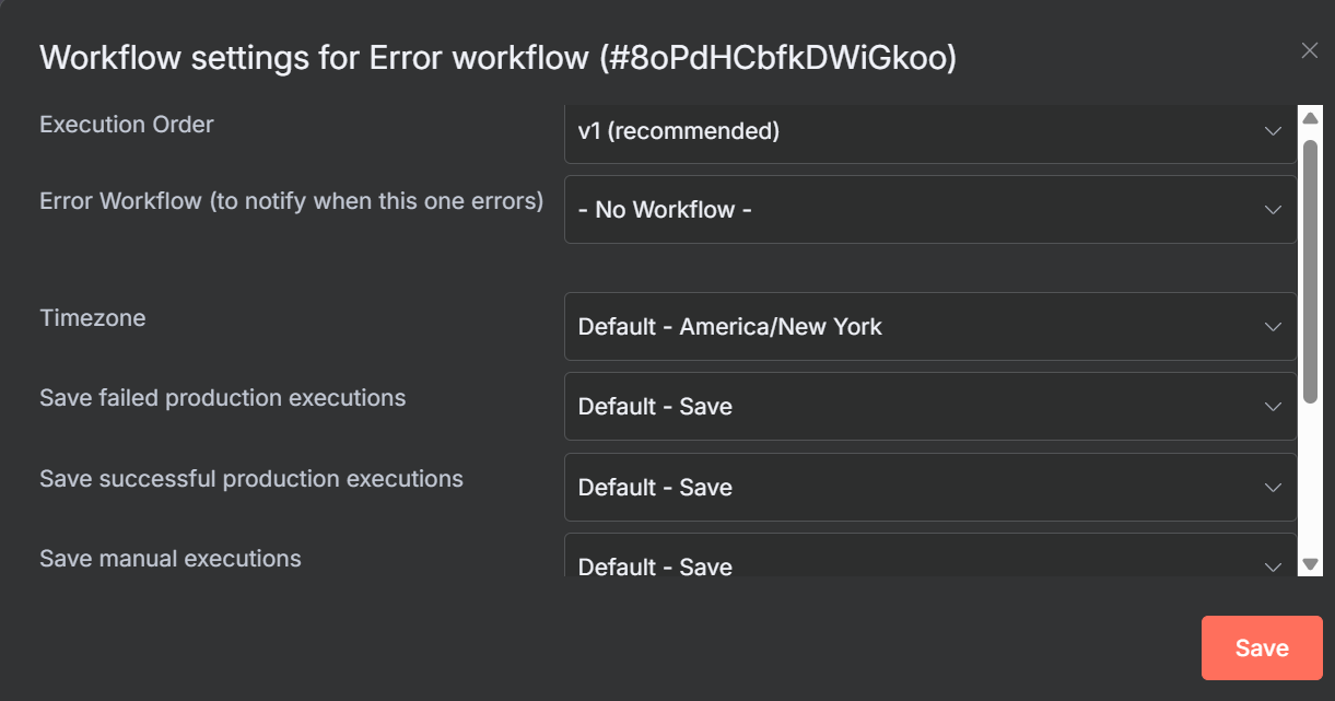 hi, I guess you have to check the settings of #5nQwFgPGlKKWmIf9 , as this is the one trying to connect to your Error workflow, also you have to set the data format in the “trigger from another workflow” node that must be in your error workflow or it won’t accept data from others.