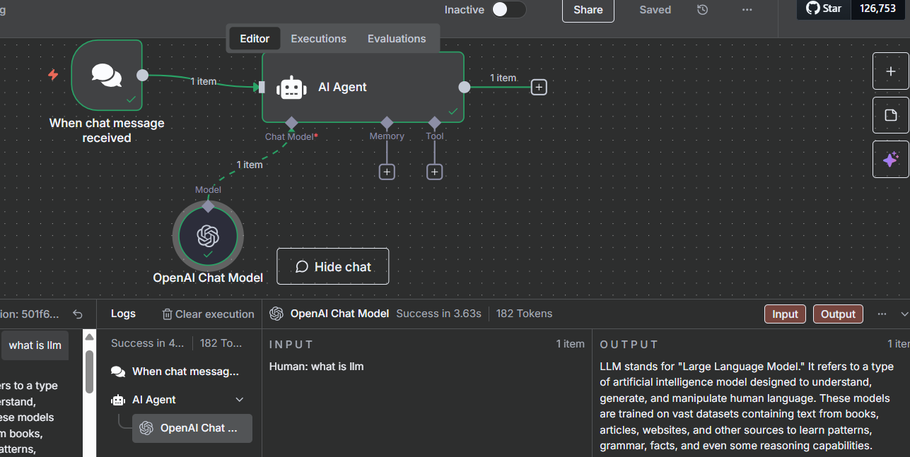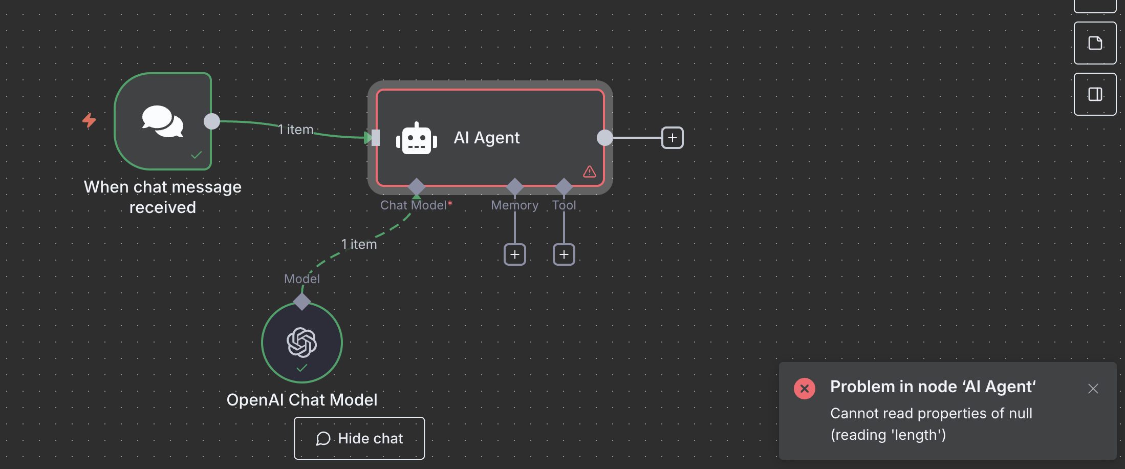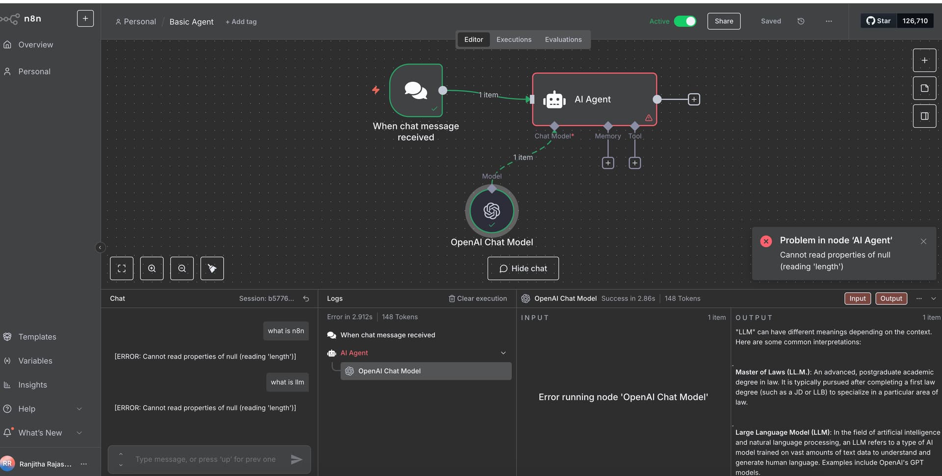I am creating my first workflow. But getting errors "cannot read properties of null (reading ‘length’).. Seems the OpenAI chat model is providing the output, but the AI agent is seeing some errors. Not able to debug.. Tried various things such as different API keys.. but nothing seems to work.