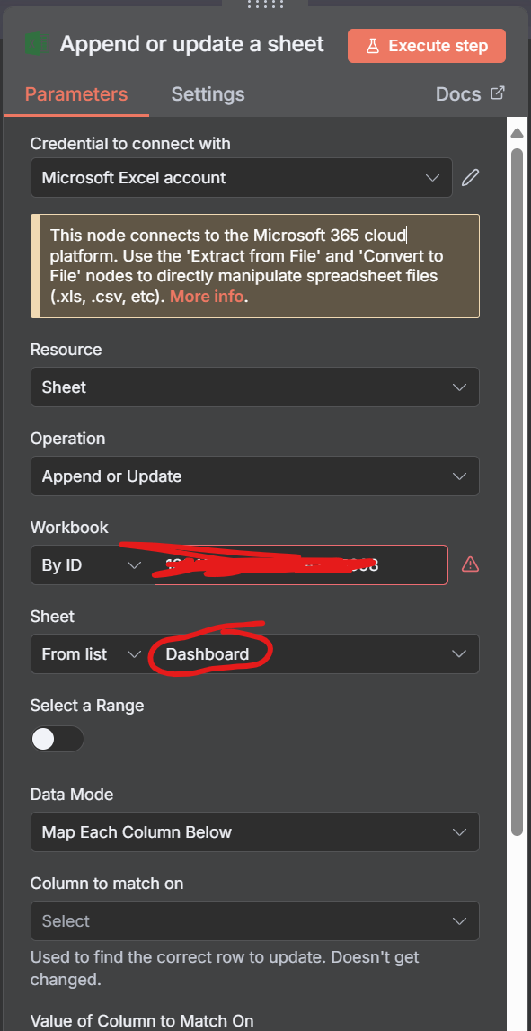 I can also see my sheets when I input the Excel ID, and it allows me to select sheets from the list after that. However, the node fails with error because the ID is wrong, even though it isn’t.