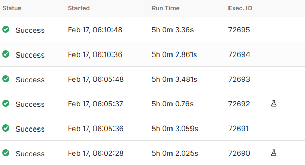 Looking at the screenshots now, that execution table is really strange — showing “5h 0m” in the Run Time column but actual execution times of 0.76s to 3.481s in another column. That definitely looks like a bug in how the UI is calculating or displaying duration, not a timezone config issue. You’re on 2.6.4 which is pretty old at this point, I’d try updating to the latest version and see if that fixes the display issue since there have been a lot of UI fixes since then.