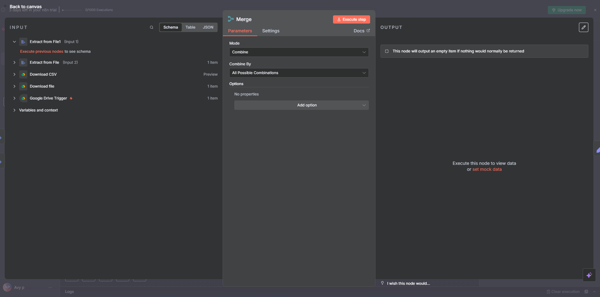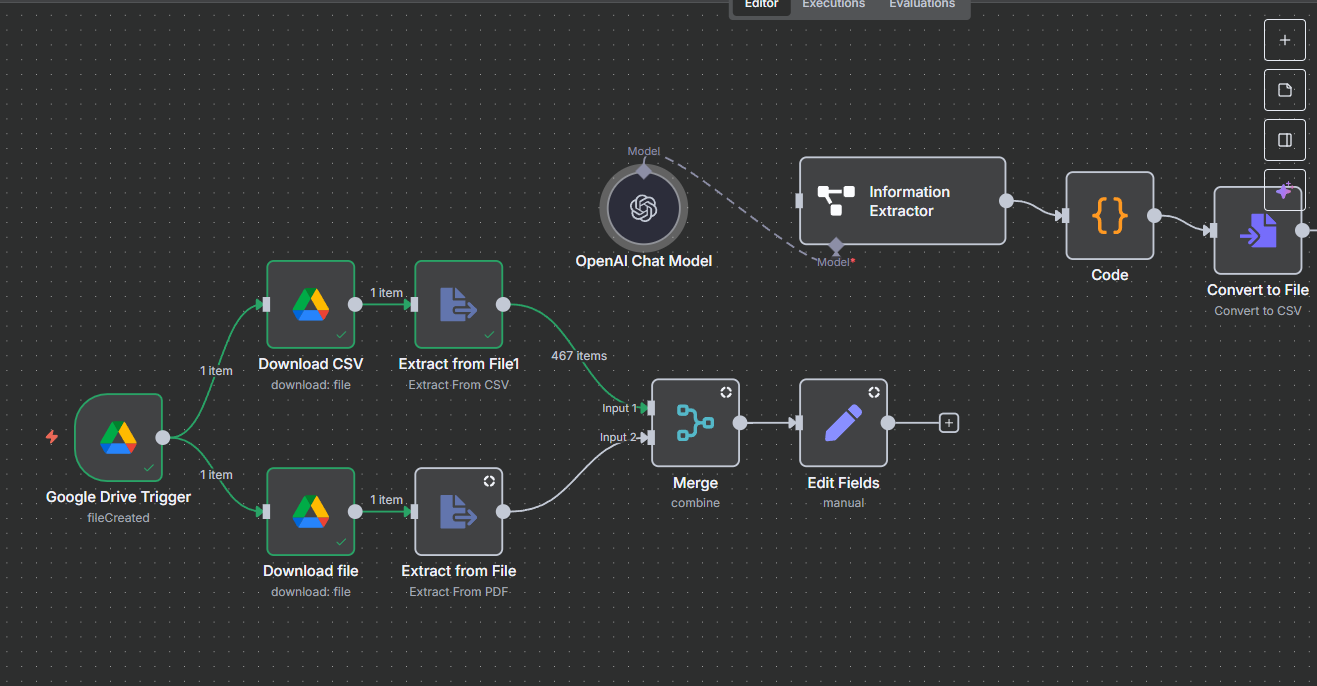 I’m working on a workflow where I want to update values in an Excel file from a PDF financial statement. The idea is to combine data extracted from a CSV file and a PDF file, process everything through the Information Extractor, then use AI for matching and finally export the results to a new CSV.