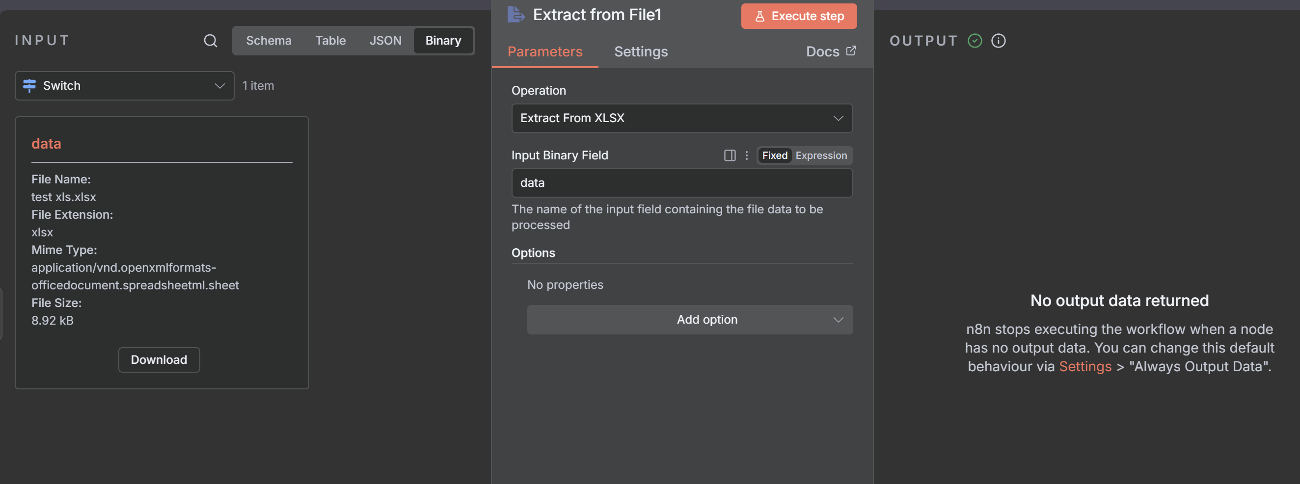 It works perfectly with PDF attachments, but when I try the same setup with an XLSX file, it returns “No output data returned”, even though the binary field is correctly detected and visible.