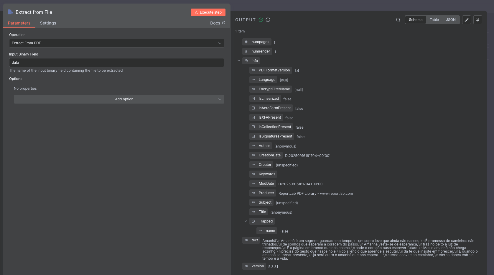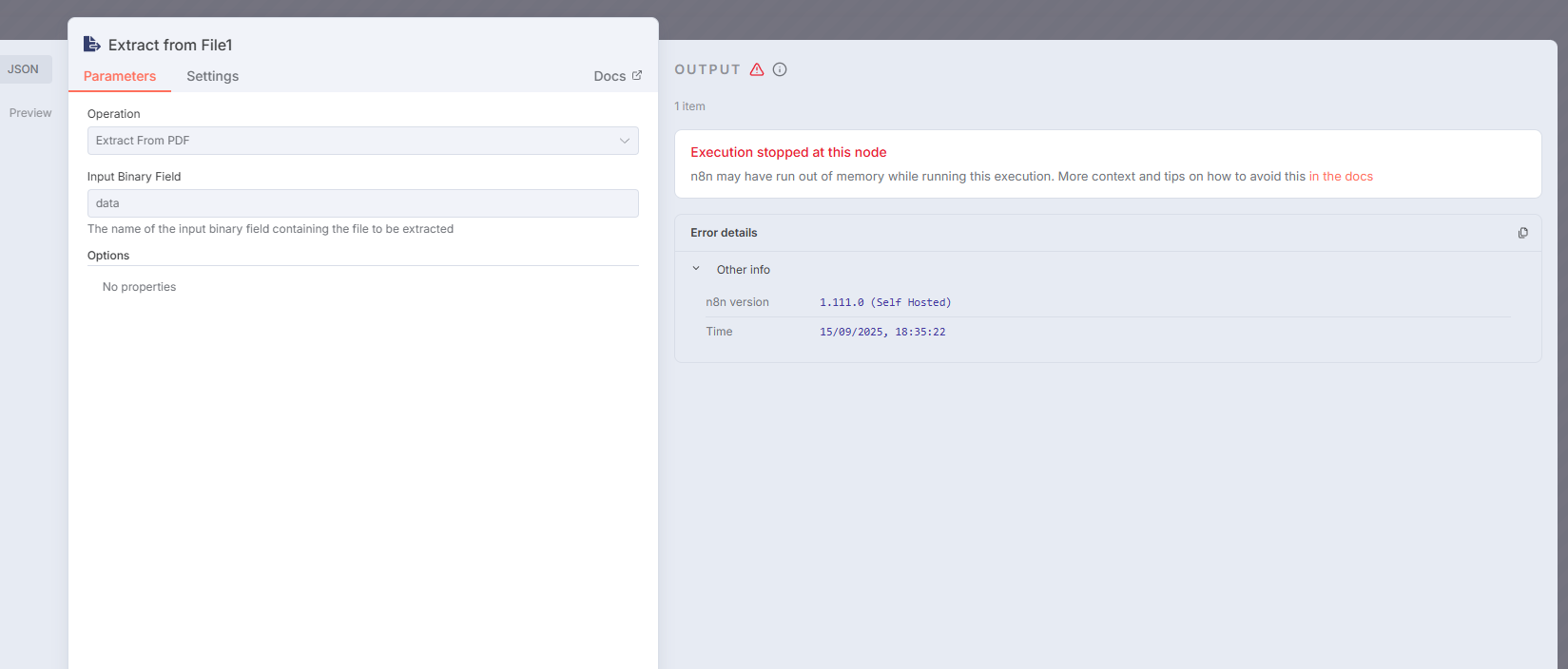 In Docker, hardware access is much more direct and consistent, without the VM barrier. Since then, the “Extract From File” node has been working normally, even with heavier PDFs.