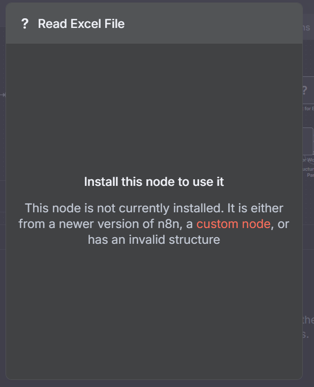 Read Excel Files: From the “excel” output of your Switch1 node, add a new node that will read the binary data and convert it into a structured JSON format. We will use the Read From File or Spreadsheet File node for this.
