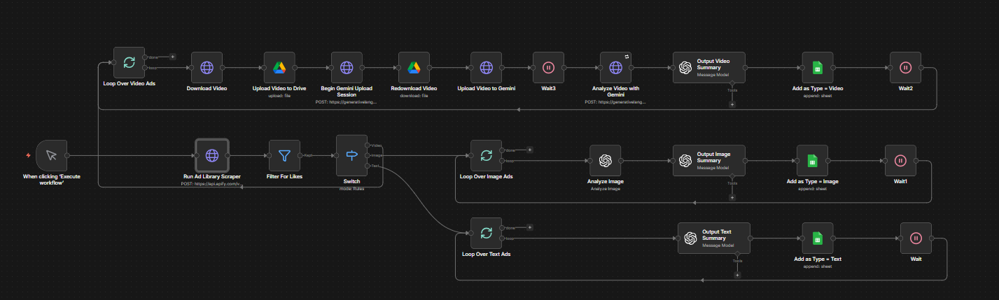 • Replaces hours of manual ad library browsing with a fully automated weekly brief