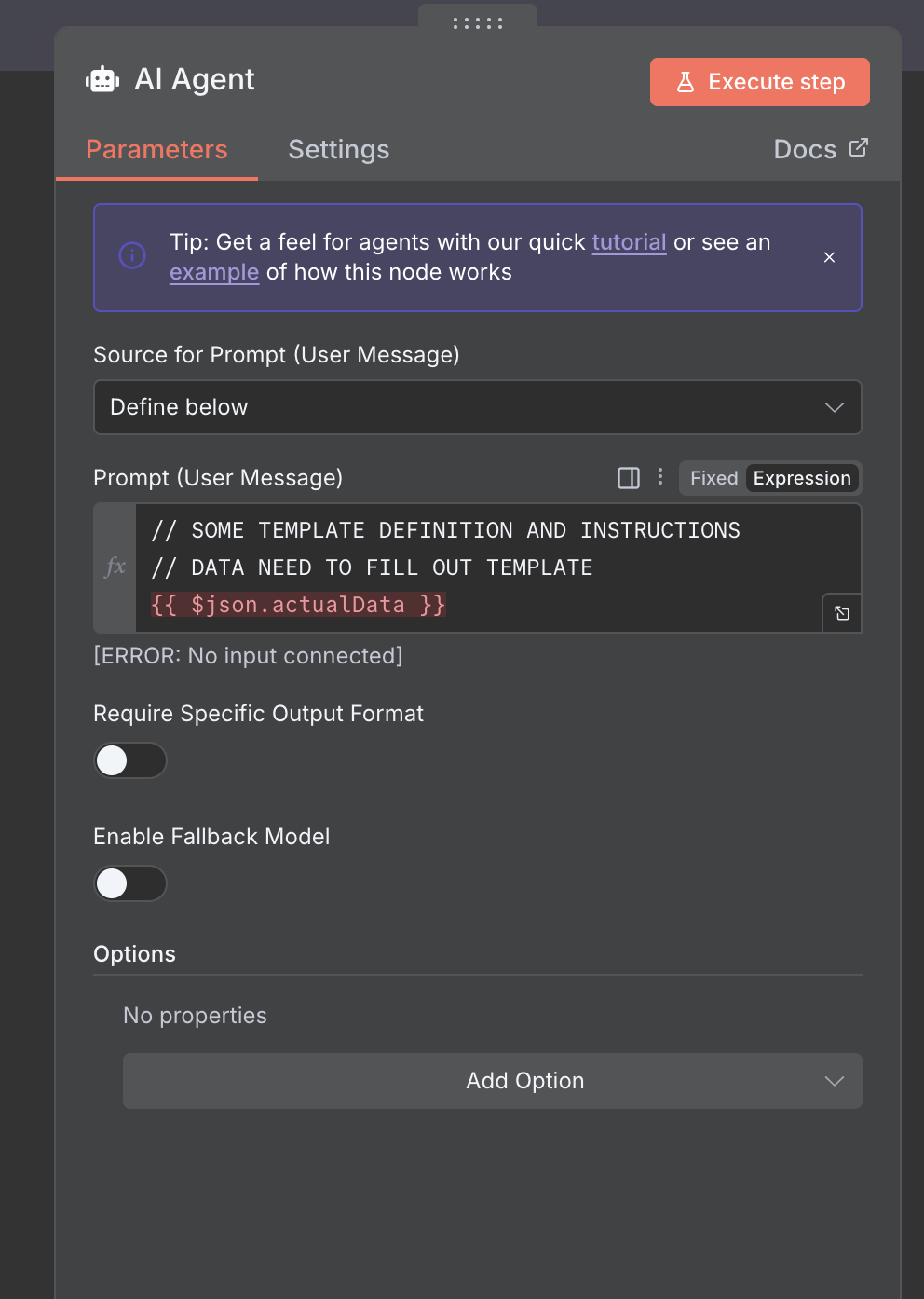 This agent only knows what you’re passing in on the left. In my case it’s a chat node. What you want to do is, in plain english (whether in a prompt, or conversations or whatever else you’re passing in) explicitely describe to the Agent what you want to accomplish and how to do it.