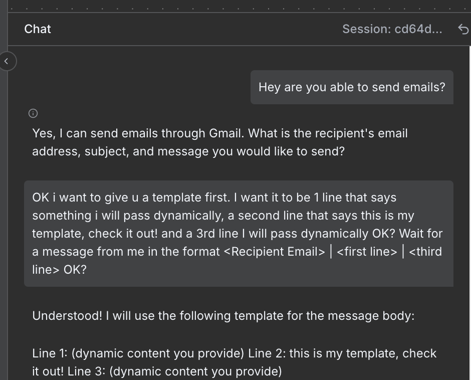 In my example. I want it to send emails so my chat looks like