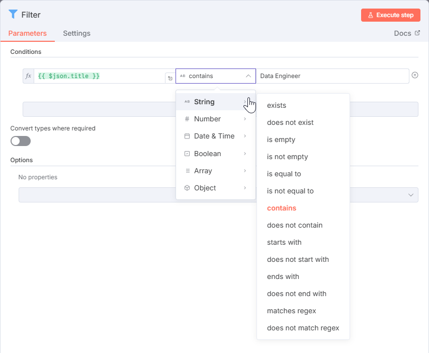 Use {{ $json.title.toLowerCase() }} and then for the value just type “data engineer”.