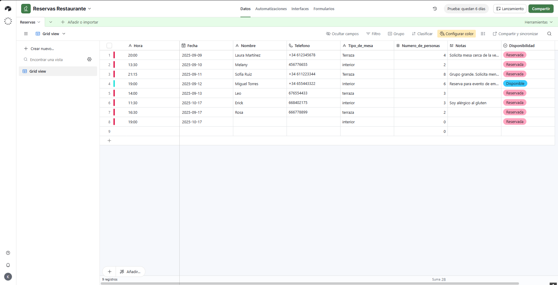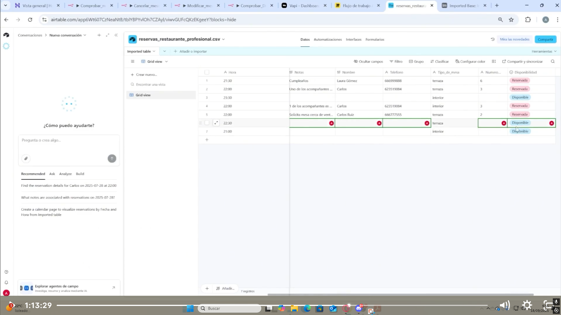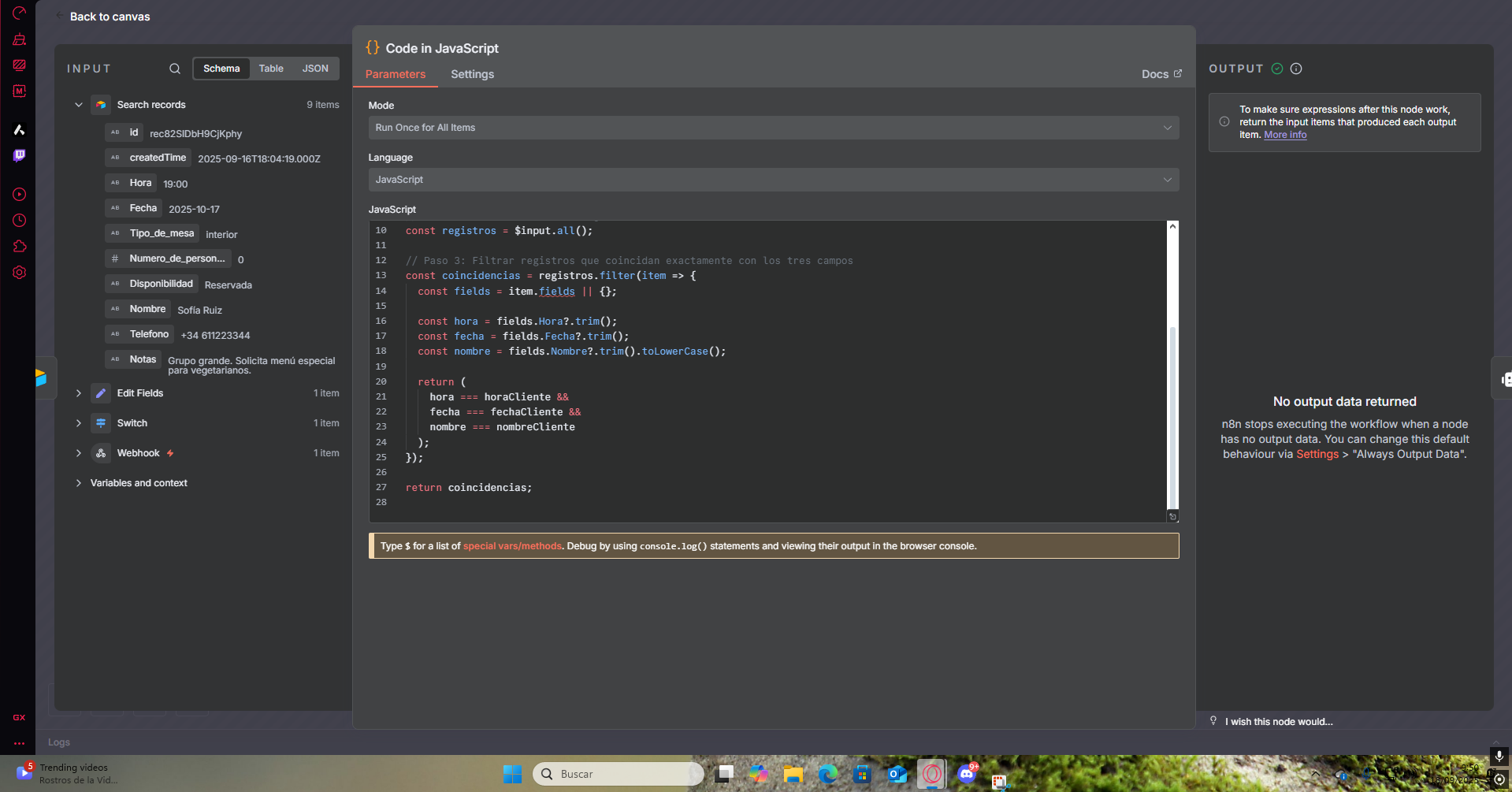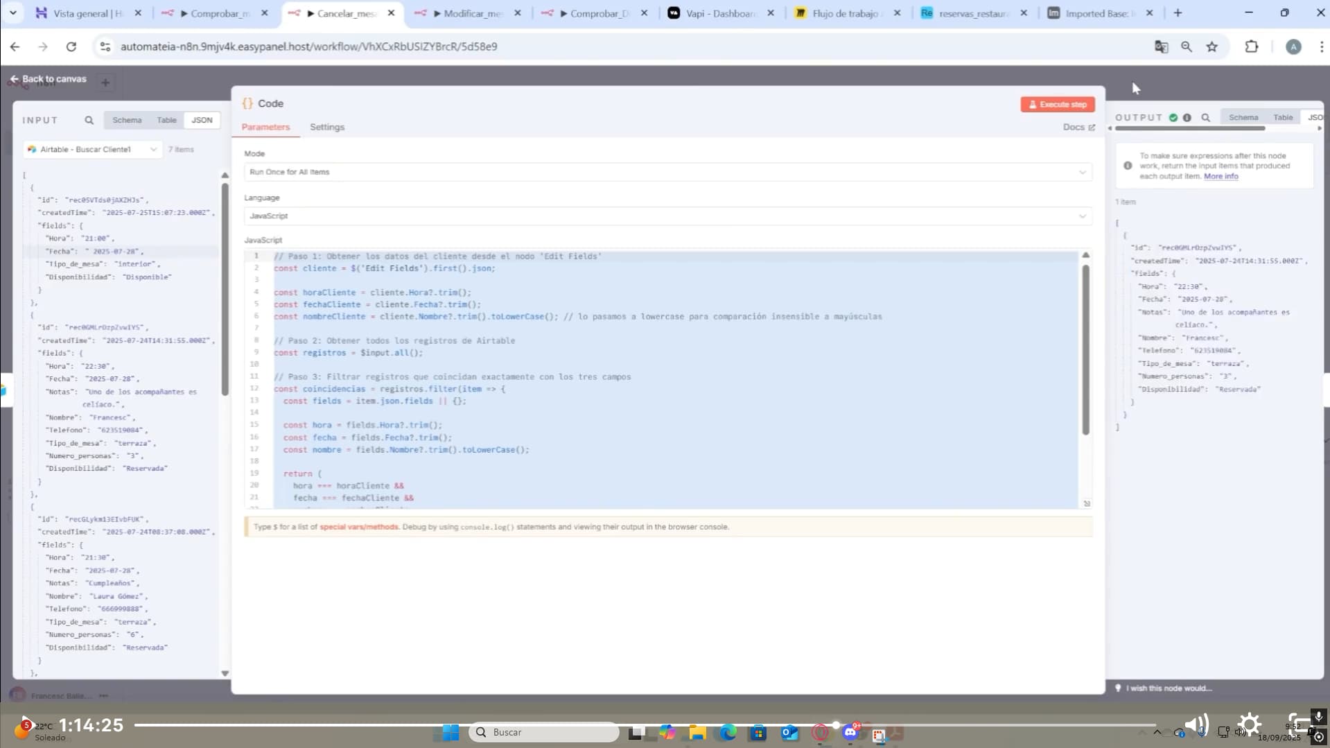 “jsCode”: “// Paso 1: Obtener los datos del cliente desde el nodo ‘Edit Fields’\nconst cliente = $(‘Edit Fields’).first().json;\n\nconst horaCliente = cliente.Hora?.trim();\nconst fechaCliente = cliente.Fecha?.trim();\nconst nombreCliente = cliente.Nombre?.trim().toLowerCase();\nconst telCliente = cliente.Telefono?.trim();\n\n// Paso 2: Obtener todos los registros de Airtable\nconst registros = $input.all();\n\n// Paso 3: Filtrar registros que coincidan con los 4 campos\nconst coincidencias = registros.filter(item => {\n const fields = item.json.fields || {};\n\n const hora = fields.Hora?.trim();\n const fecha = fields.Fecha?.trim();\n const nombre = fields.Nombre?.trim().toLowerCase();\n const tel = fields.Telefono?.trim();\n\n return (\n hora === horaCliente &&\n fecha === fechaCliente &&\n nombre === nombreCliente &&\n tel === telCliente\n );\n});\n\n// Paso 4: Devolver coincidencia o mensaje de error\nif (coincidencias.length === 0) {\n return [{\n json: {\n resultado: “No se encontró ninguna reserva con esos datos para cancelar.”\n }\n }];\n}\n\nreturn coincidencias;\n”