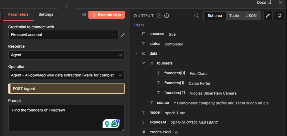 "customBody": "{\n \"prompt\": \"Find the founders of Firecrawl\",\n \"urls\": [\"https://firecrawl.dev\"],\n \"schema\": {\n \"type\": \"object\",\n \"properties\": {\n \"founders\": {\n \"type\": \"array\",\n \"items\": {\n \"type\": \"object\",\n \"properties\": {\n \"name\": { \"type\": \"string\" },\n \"role\": { \"type\": \"string\" }\n }\n }\n }\n }\n }\n}",