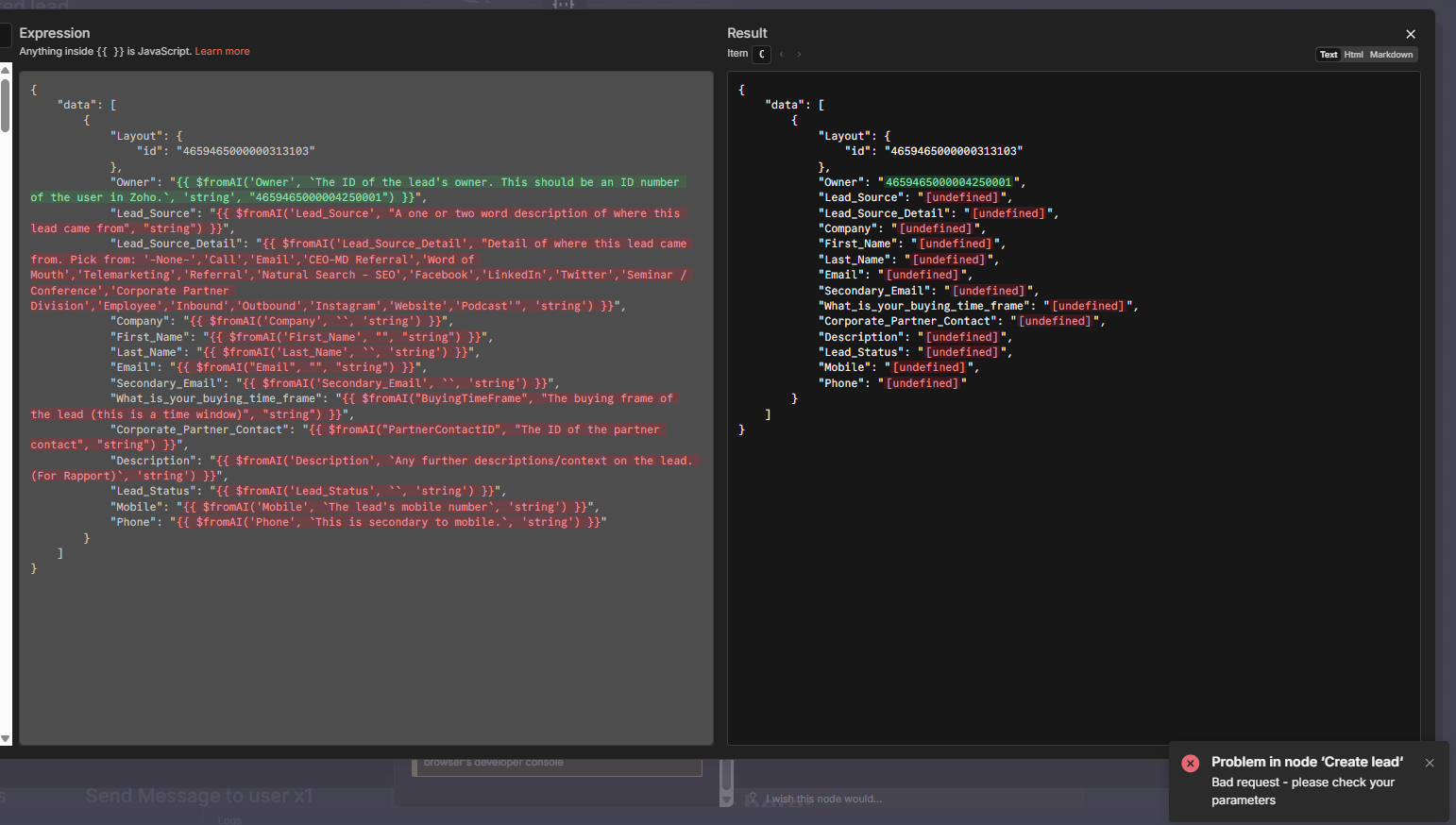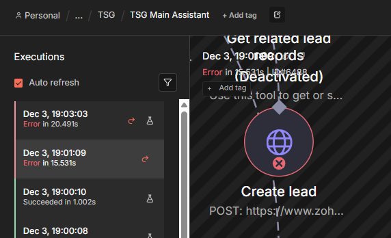 In my execution, it shows as red, and I get this error (using Zoho API)