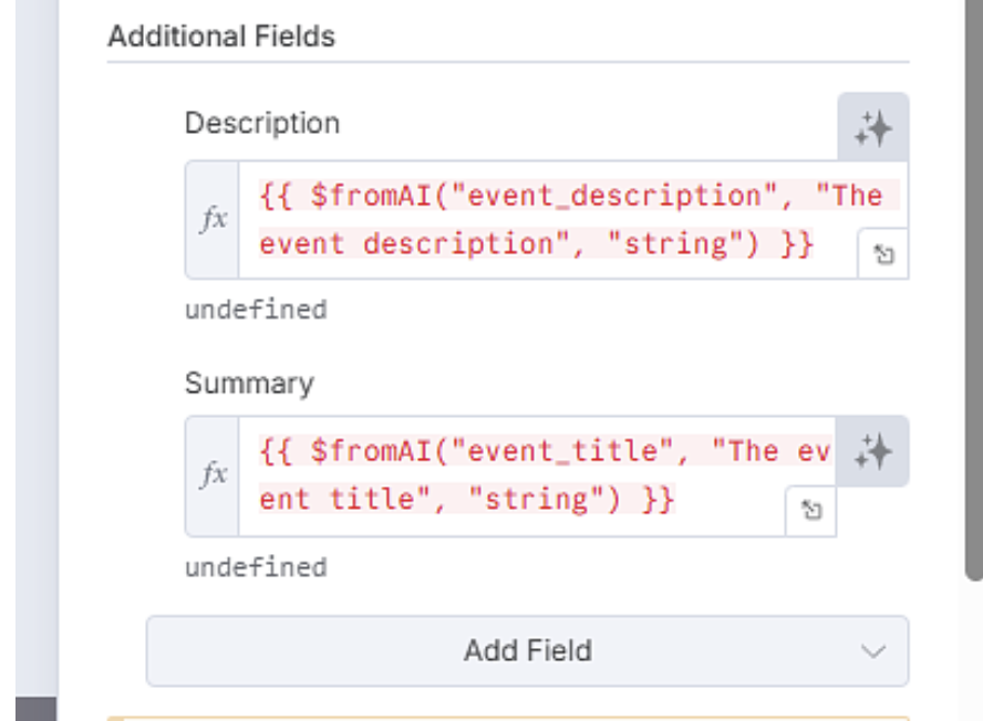No, it still stays red (marked as undefined), but I noticed that the LLM actually generates the summary and the description, so the function works, but the field is still marked in red. Maybe it’s a bug in n8n?