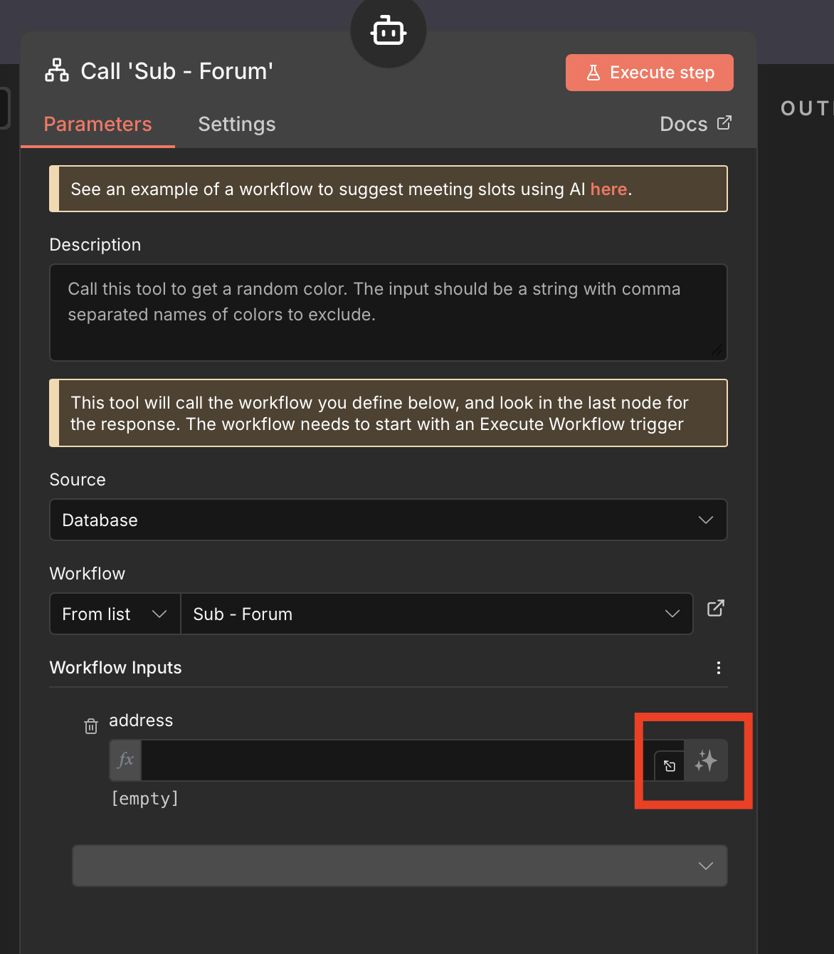 As per my previous post, on the sub-workflow, make sure you set the property like below. Only then will the option to set the address appear in the main workflow agent with the magic button