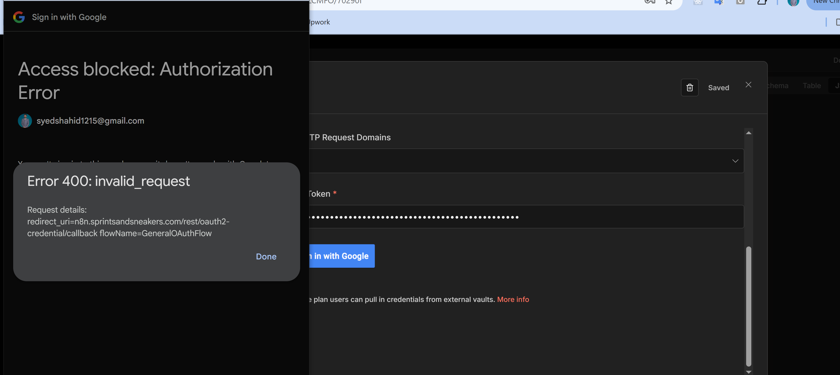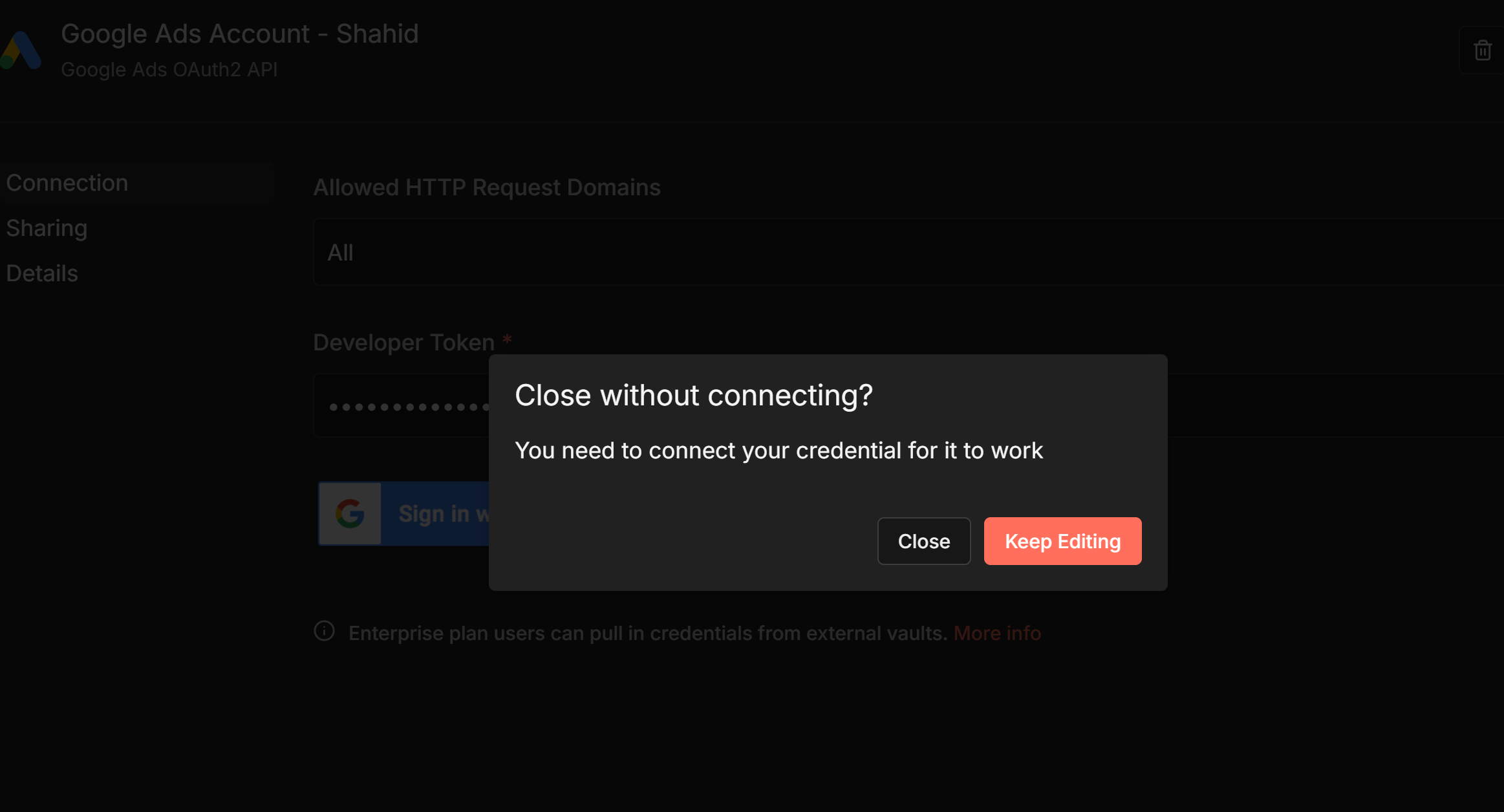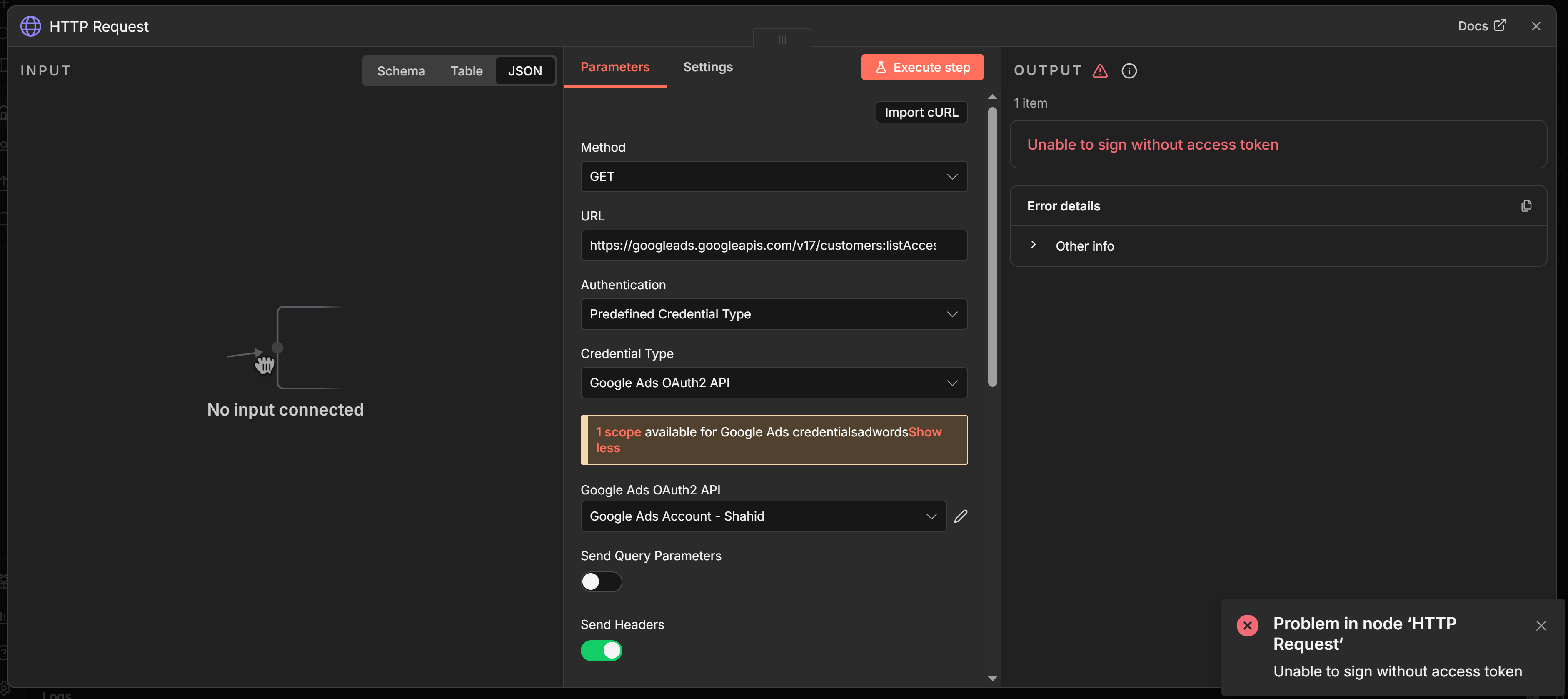 Hi, I am facing the error while setting up the google ads credentials in n8n. I have successfully extracted the Client ID and Client Secret from google cloud console and Developer Token from Google Ads Manager Account with Basic Access Level. When i save the creds and try to close the credential modal it says you need to connect the credentials before closing it. If I click on google button i get this error. When i make a custom api call to this endpoint using predefined creds that i set up using google ads node it throws this error