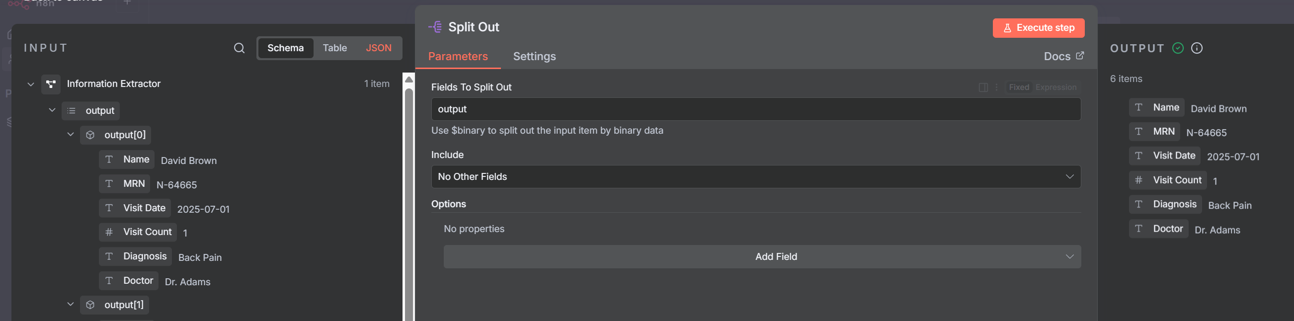 This schema will separate all the information. However, now we still have “1 item” as output which is completely normal. We now use the “Split Out” node to split them if we later want to process each item separately: