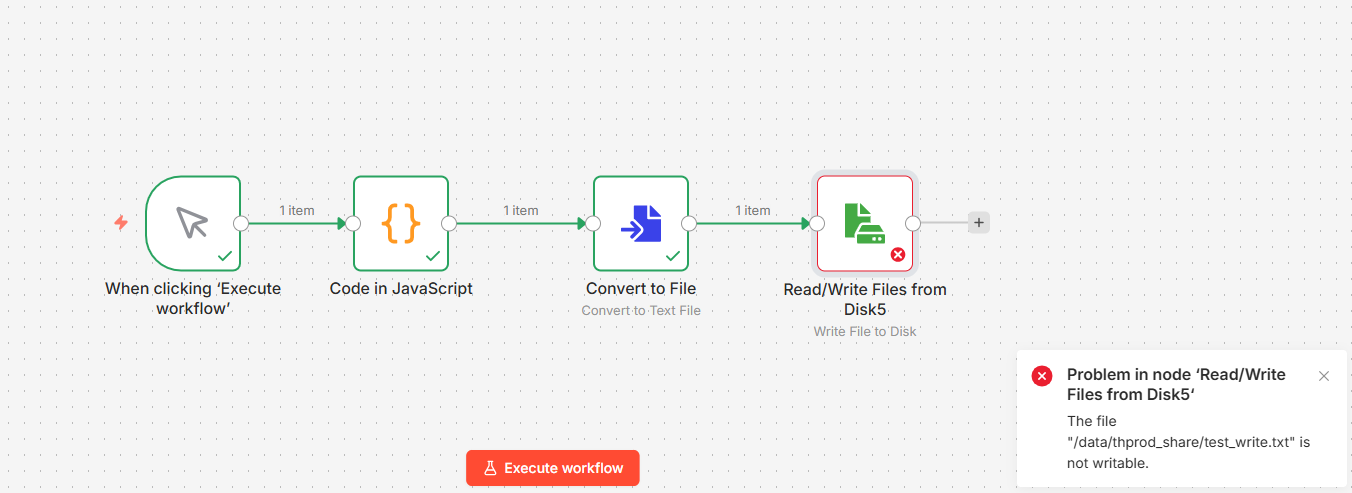 I am unable to write file to file share. I keep getting ‘File xxxx is not writable’. I can manually write the file to the disk from the docker container but not from n8n itself.