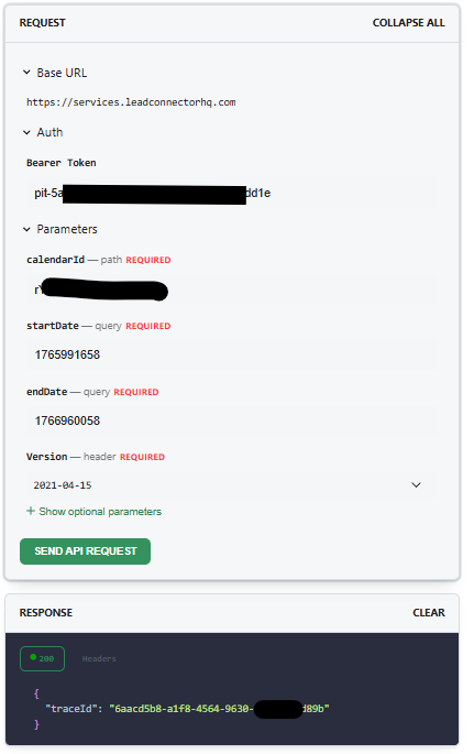 However when I try to use the API request (get free slots) it successfully runs, but returns no slots, just the traceId. Get Free Slots | GHL API