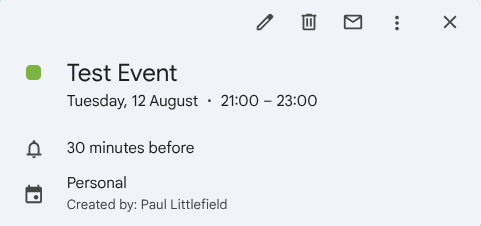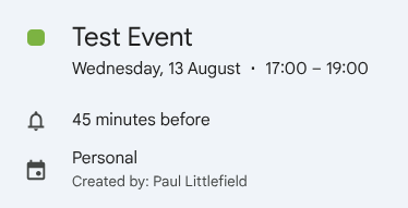 “Personal, Test Event, today at 2pm for 2 hours, with a reminder 10 minutes before the event.”
