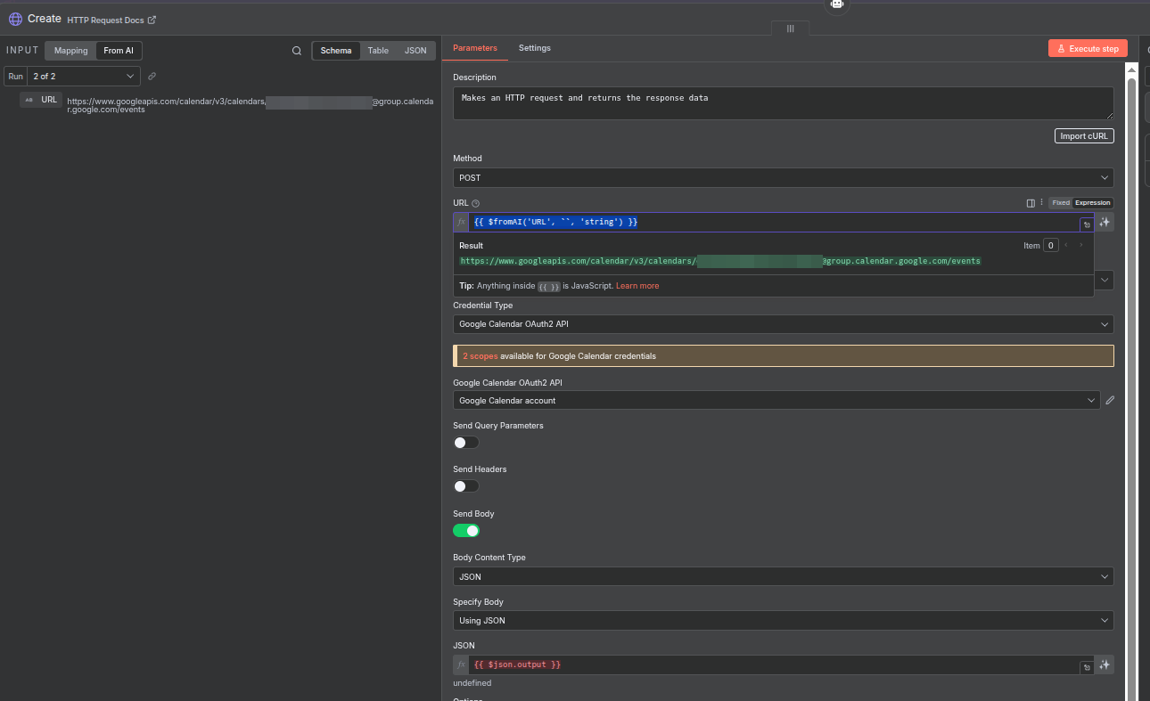 Do you think I need take some of the (working) output from version 1 workflow (with the official Google Calendar node) to build the complete JSON data needed for the ‘HTTP Request’ ?