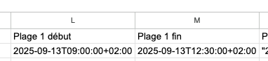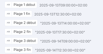 As you can see, when I try to create an event for “Plage 1”, it creates it with no problem (notice no quotation marks for the date), when I switch to the “Plage 2”, it throws an error.