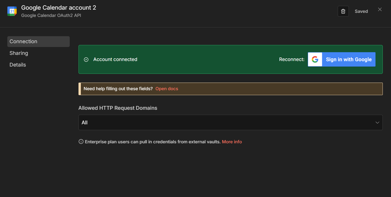 hey on my google calender on n8n it doesn’t show a redirect url, client detail or client secet, all it says is “allowed https request domains” how do i fix this?