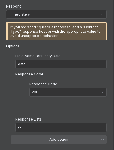Google Chat requires the webhook response to have a specific header / body, otherwise it’ll consider the response invalid and send the alert message. You can’t use the pre-defined settings, but have to configure the webhook response like this: