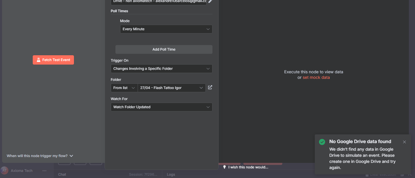 When using the “Fetch Test Event” button on the Google Drive Trigger node, it is unable to find any data on n8n versions 1.92.0 and newer. The issue seems to affect all “Watch For” events (such as Watch Folder Updated, File Created, File Uploaded, etc.) when the trigger is configured to monitor a specific folder.
