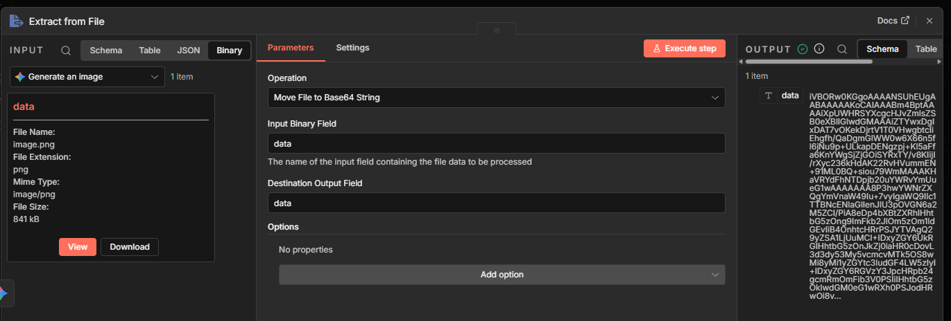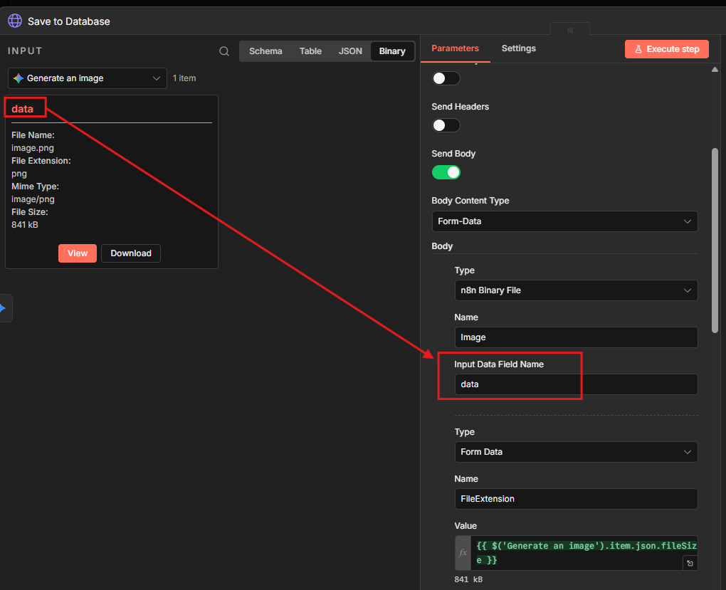 “name”: “FileExtension”, “value”: “={{ $(‘Generate an image’).item.json.fileExtension }}”