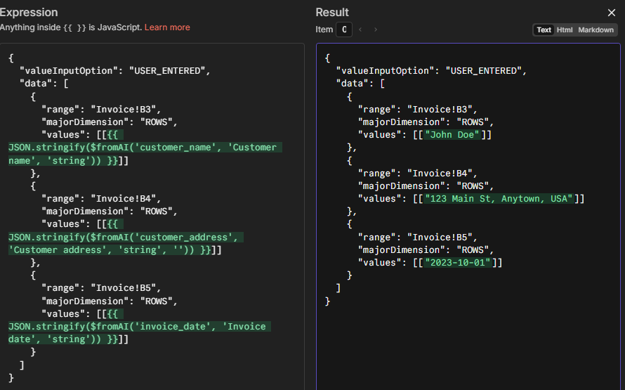 <Hi, I’m using n8n to populate an invoice in Google sheets based on a template invoice. The Google sheets node asks for the location of the Header row and the first row of data which is to be populated. This tells it where to put the invoice data and it does that very well. I also need it to populate customer name, address, and date above that. I have tried using a second Google sheets node just to populate the header but it keeps putting the info at the bottom of the invoice. I have also tried specifying the cells in the Agent system message but no luck. Any suggestions?