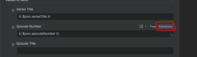 My Google Sheets node is not evaluating any expressions. It writes the raw expression text (e.g., {{ $json.seriesTitle }}) into the cells instead of the actual data. This is preventing my workflow from functioning.
