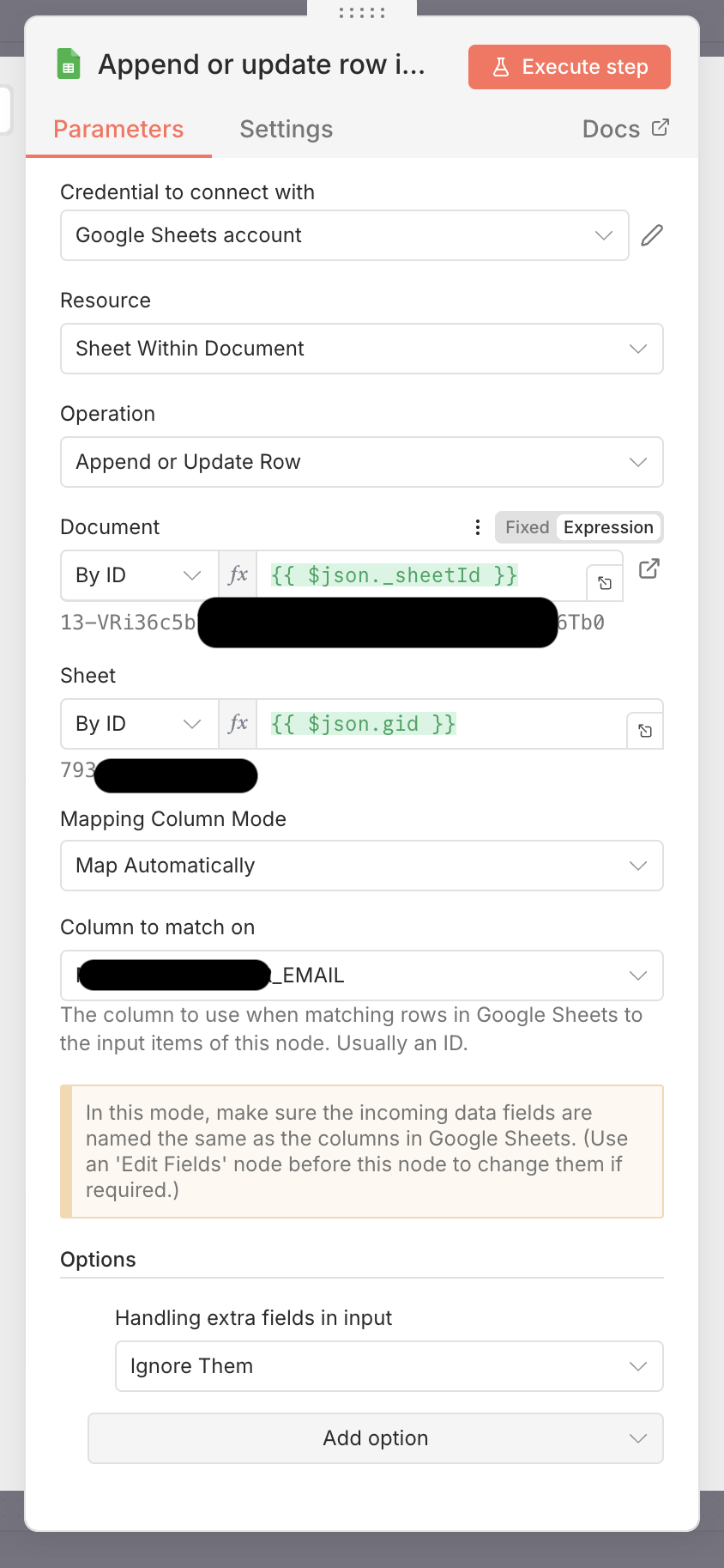 When I set the parameters in the Google sheet node, the data maps automatically to the columns and fills the data on the Google Sheet successfully. BUT after that step is executed the node removes the sheet name and mapping. I then need to enter the sheet name and configuration again. See below for screen shots before and after I execute the step: